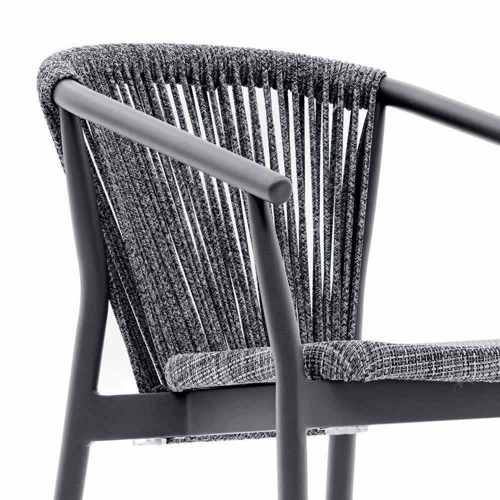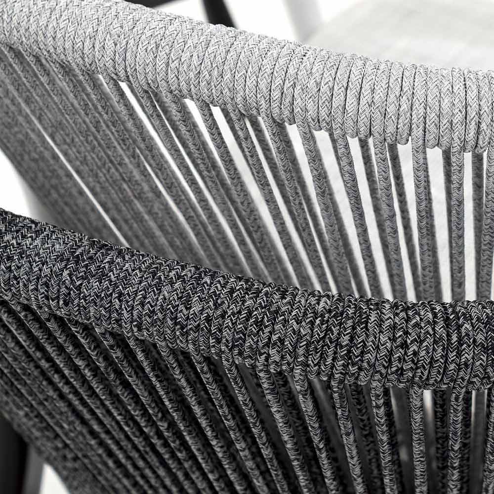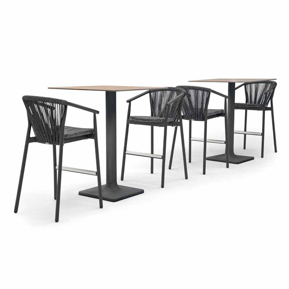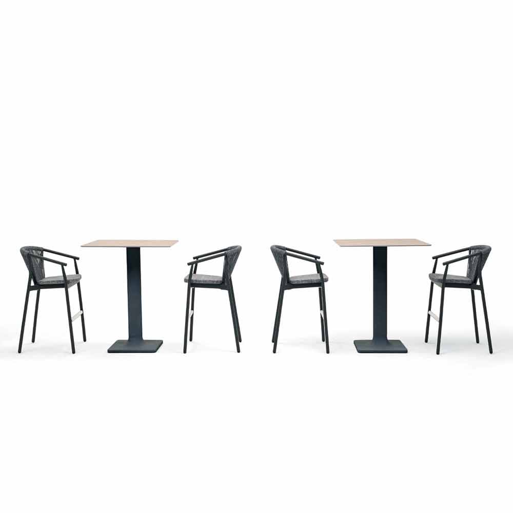 Stołek zewnętrzny o nowoczesnym designie z aluminiową podstawą i siedziskiem z tkaniny technicznej w kolorze białym lub jesionowym.
