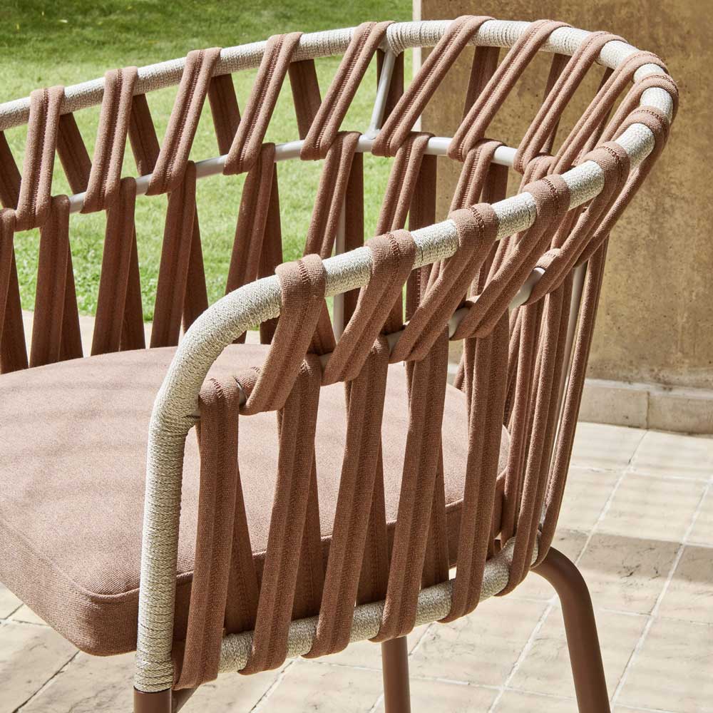 Stołek ogrodowy z aluminiowa konstrukcja malowana proszkiem epoksydowym w wykończeniu rdzawym, siedzisko z wyjmowanej tkaniny w kolorze rdzy i oparcie z aluminium wzbogacone o przeplatanie się sznurków z tkaniny akrylowej w wykończeniu rdzawym, w całości wykonane we Włoszech . Innowacyjne i świeże rozwiązanie wyposażenia, które dzięki swojej eleganckiej i nowoczesnej estetyce jest idealne, aby cieszyć oko, a jednocześnie oferuje przyjemne i szczególnie wygodne siedzisko .