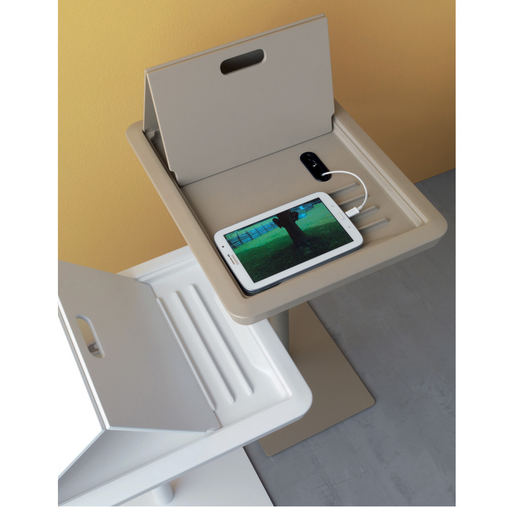 metalową podstawę malowaną proszkowo i blat z pcv w tym samym kolorze, który można otwierać i modulować. Został zaprojektowany i zaprojektowany do obsługi tabletu, z