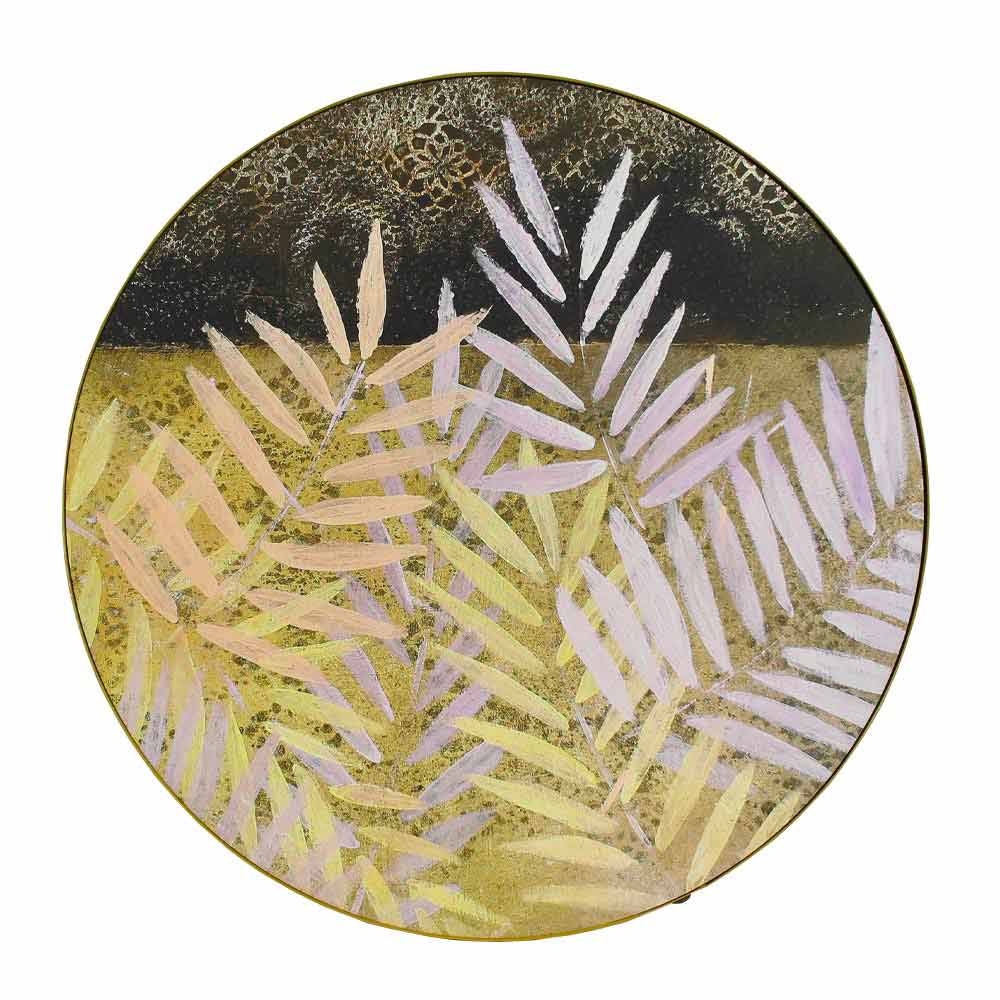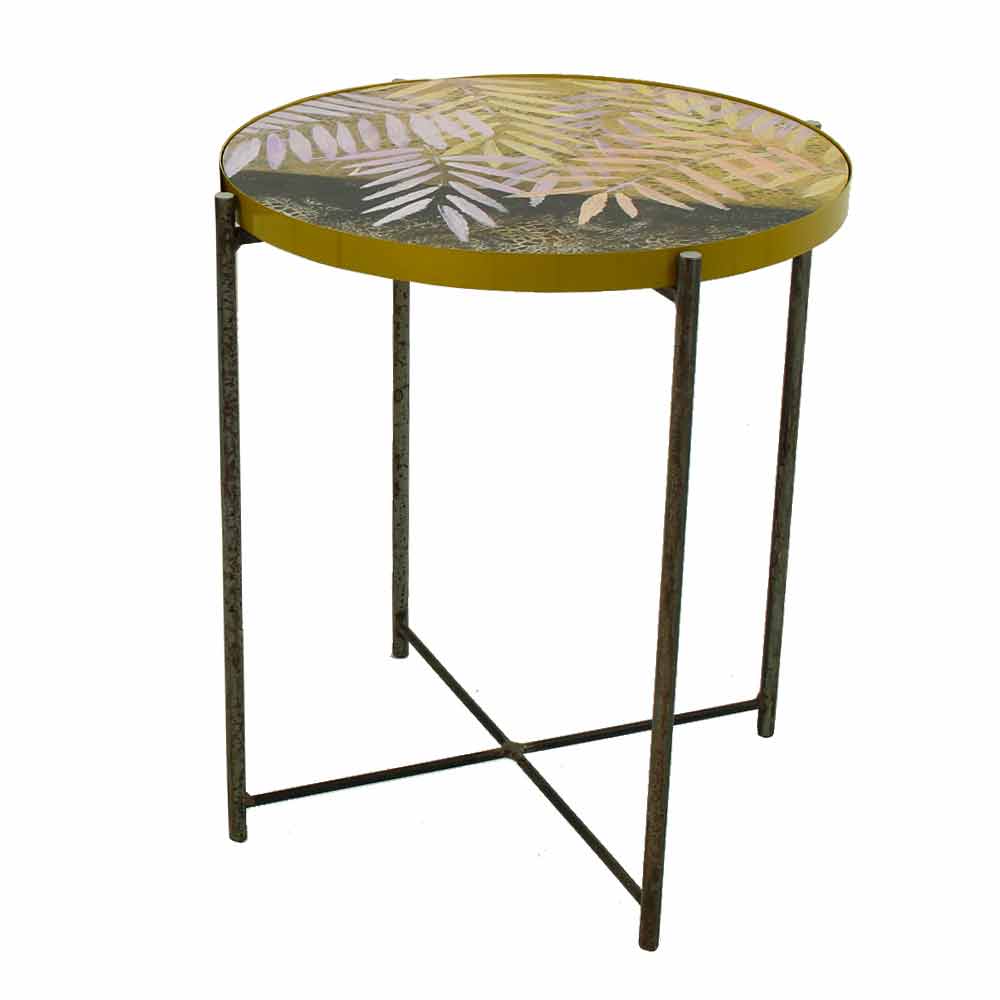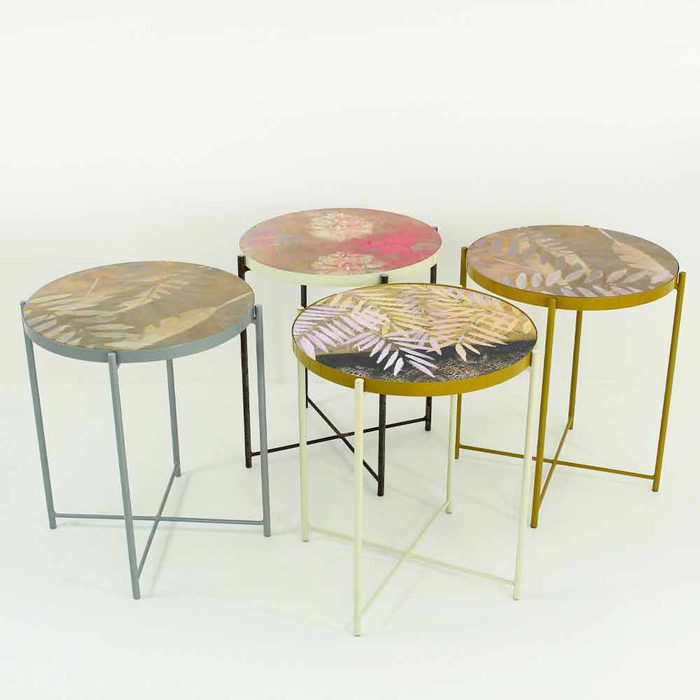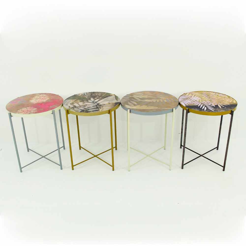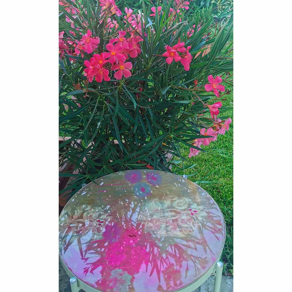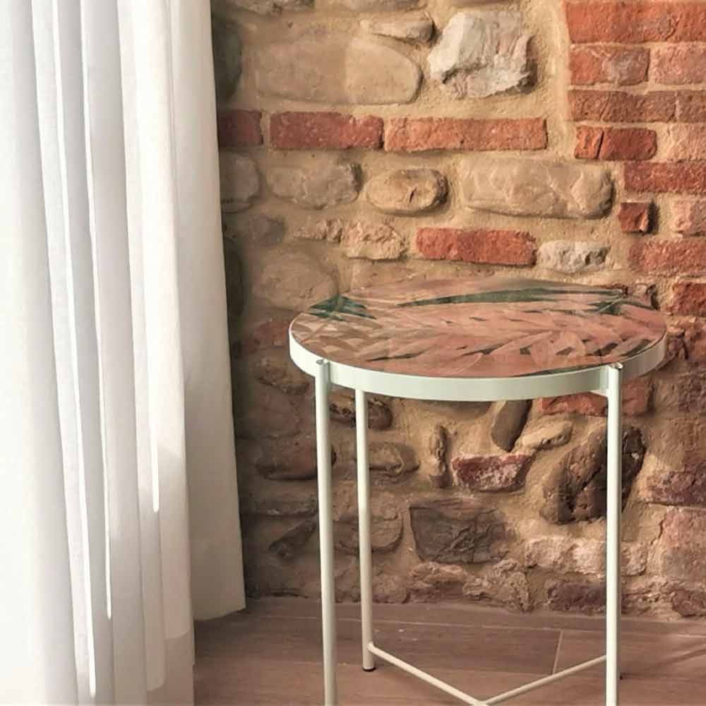 Stolik kawowy do wnętrz lub na zewnątrz z metalową podstawą i blatem zdobiony i pokryty żywicą Made in Italy.