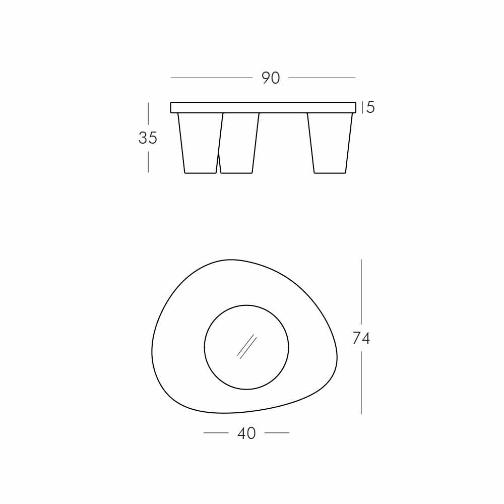 Składa się z konstrukcji z trzema polietylenowymi nogami i blatem ze szkła hartowanego. Dostępny w trzynastu różnych kolorach i istnieje możliwość zamówienia wersji lakierowanej z możliwością wyboru różnych kolorów.