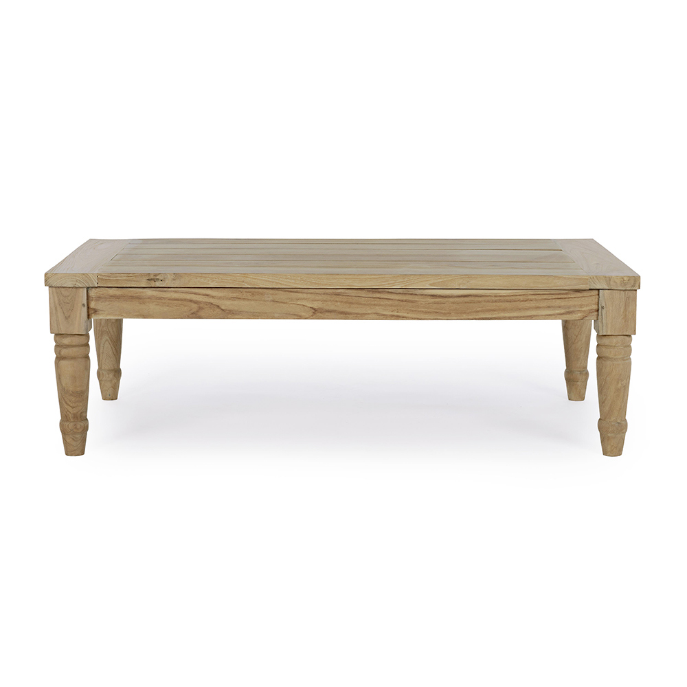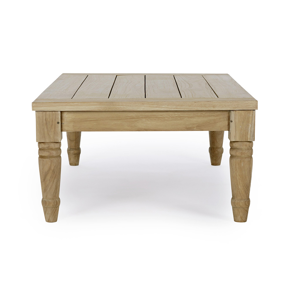 Prostokątny stolik kawowy na zewnątrz z drewna tekowego z rustykalnym wykończeniem.