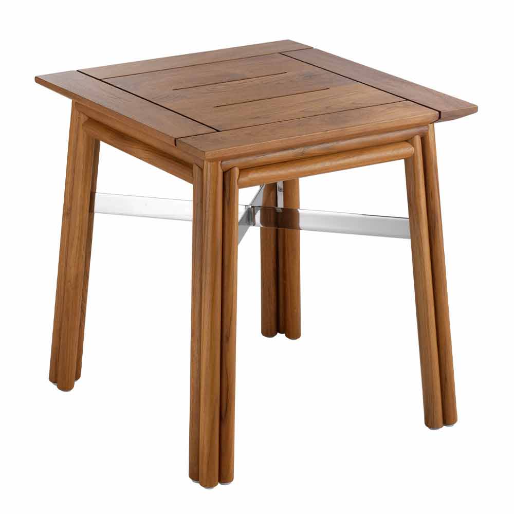 Kwadratowy stolik zewnętrzny z czarnego lub naturalnego drewna, wyprodukowany we Włoszech.