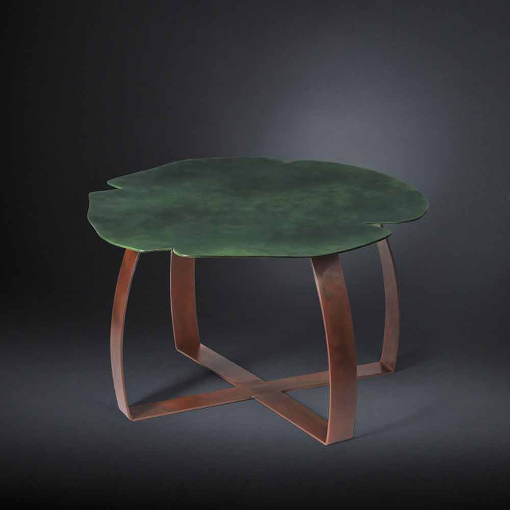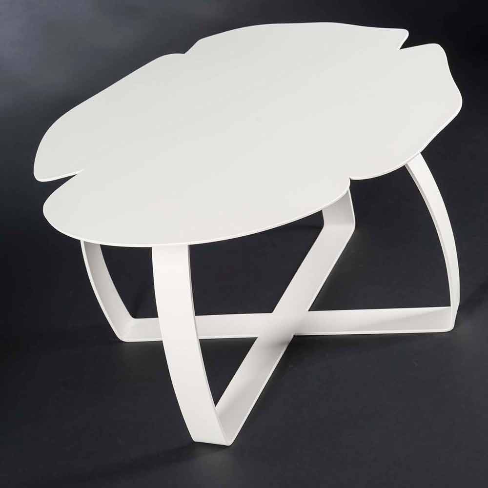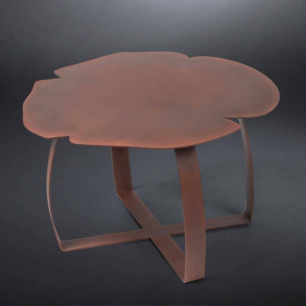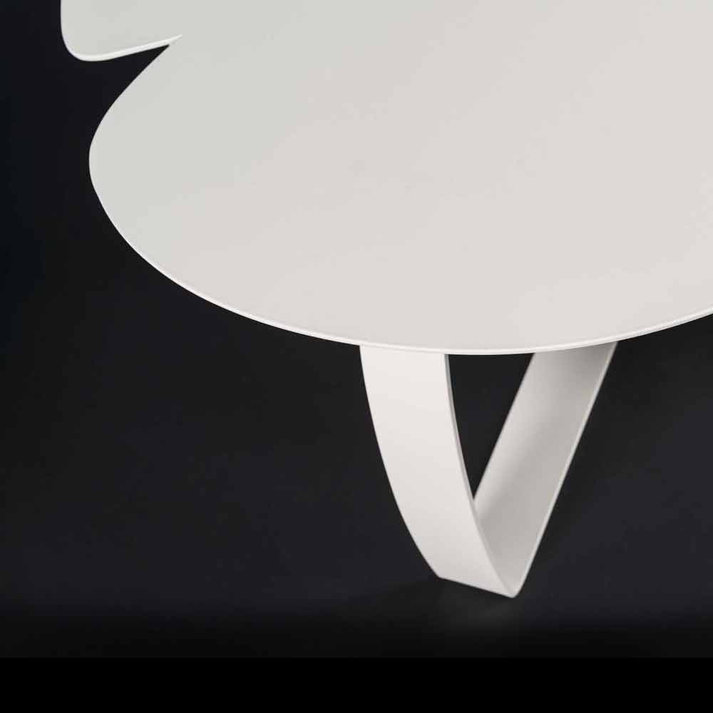 Stolik wykonany całkowicie z metalu ciętym laserem w kształcie liścia.