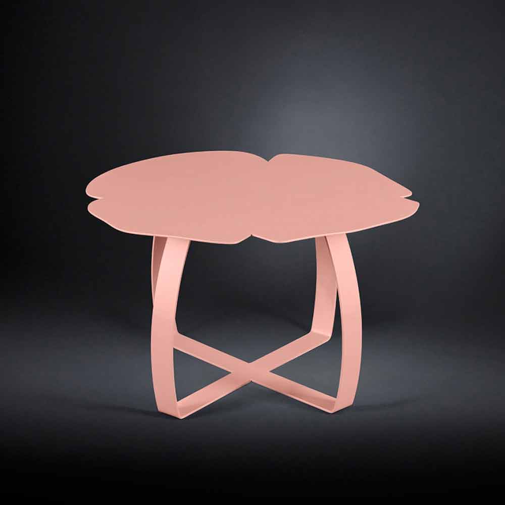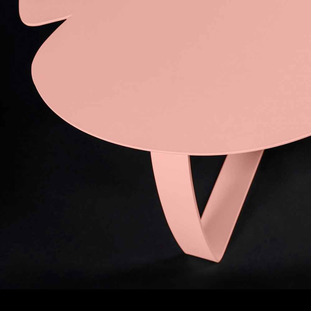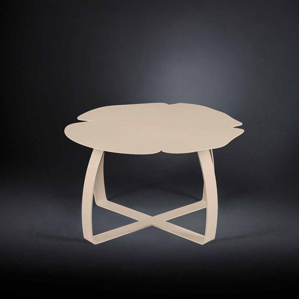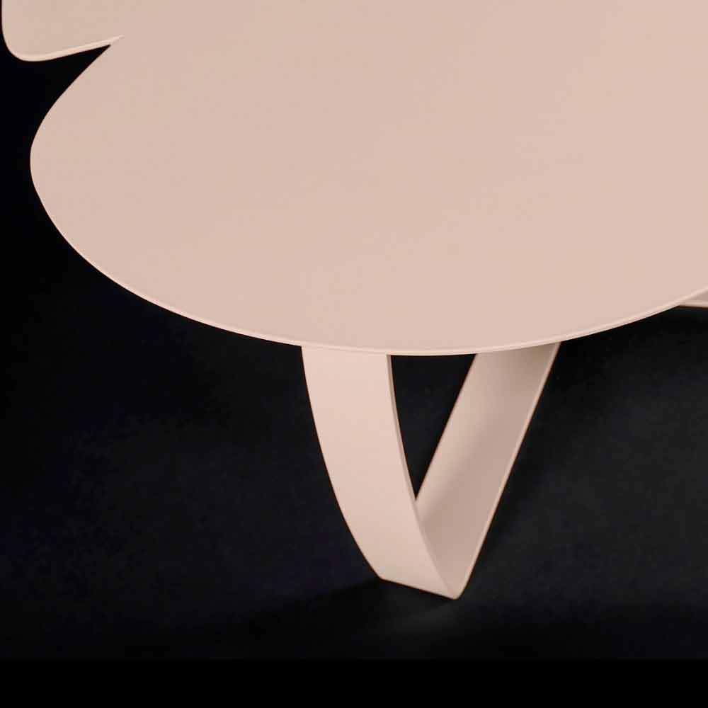Stolik wykonany całkowicie z metalu ciętym laserem w kształcie liścia.