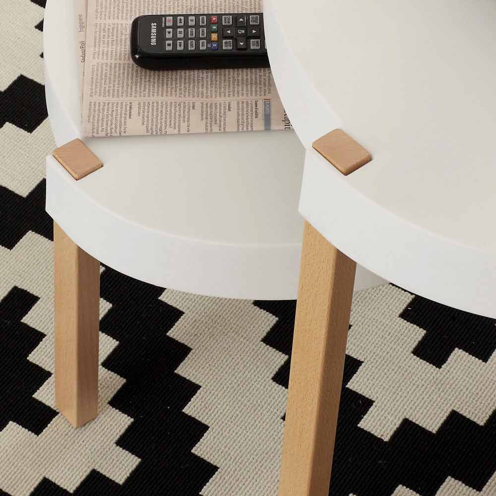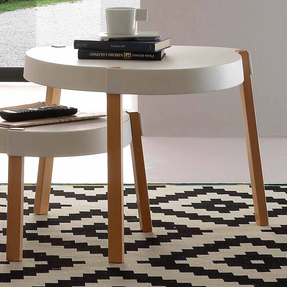 Stolik kawowy design Pineto z białym blatem z polipropylenu i nogami z drewna bukowego.