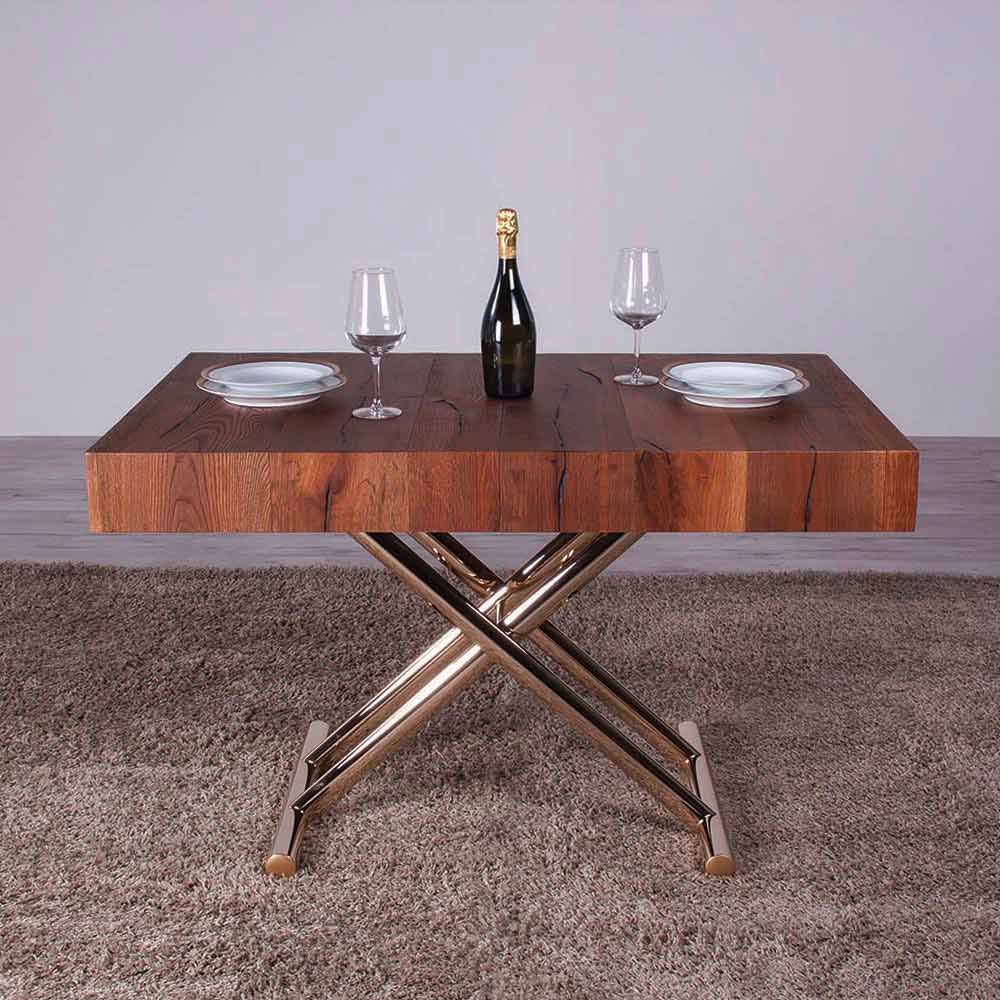 Nowoczesny stolik kawowy, który można przekształcić w stół jadalny z drewnianym blatem i metalową podstawą Made in Italy.