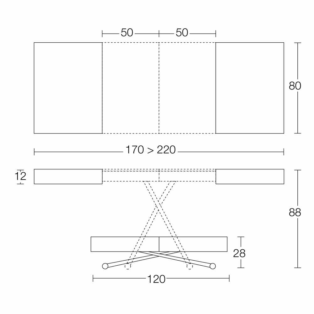 Blat jest prostokątny i można go rozszerzyć za pomocą 2 wewnętrznych przedłużeń po 50 cm każde.