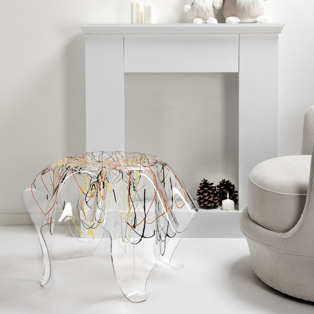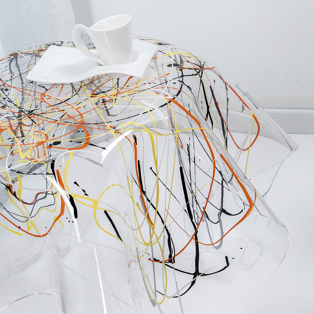 Stolik kawowy wykonany w 100% z pleksiglasuPMMA z pierwotnego polimeru. Oryginalne i nowoczesne rozwiązanie meblowe charakteryzujące się eleganckimi, ręcznie wykonanymi zasłonami , które podkreślają jego wyjątkowość i wartość. Zaprojektowany do salonu lub sypialni, służy jako element dekoracyjny o silnej, nowoczesnej osobowości , oferując jednocześnie funkcjonalną i solidną powierzchnię oparcia .