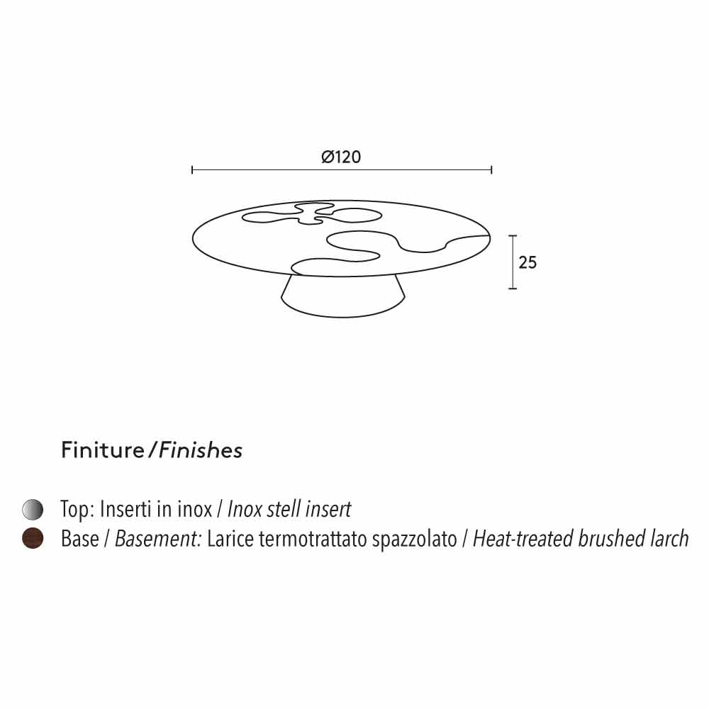 Stolik kawowy charakteryzujący się blatem z wstawkami ze stali nierdzewnej i obniżeniami. Podstawa stożkowa ze szczotkowanego termo-poddanego obróbce modrzewia.