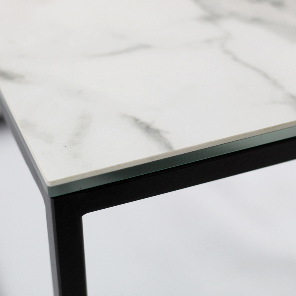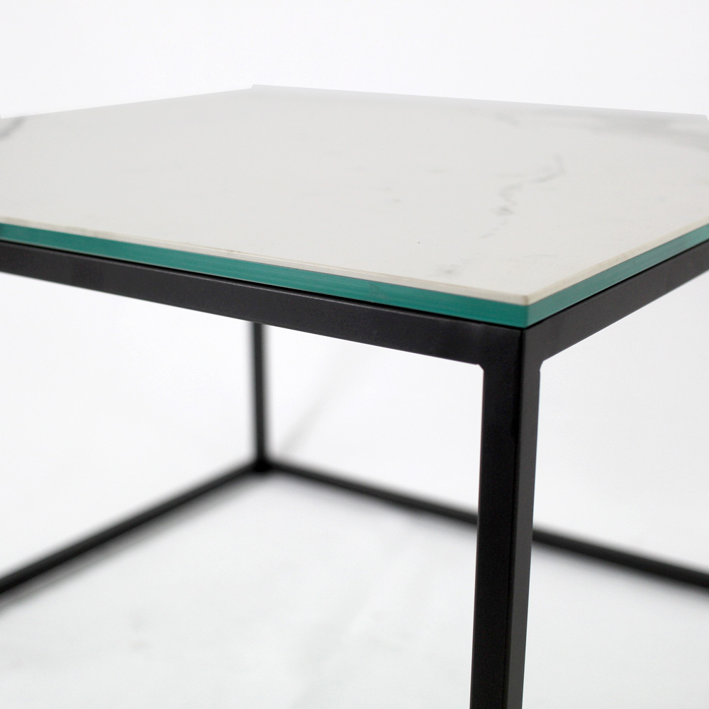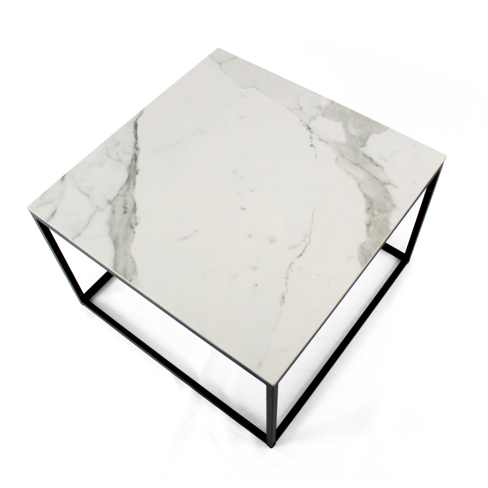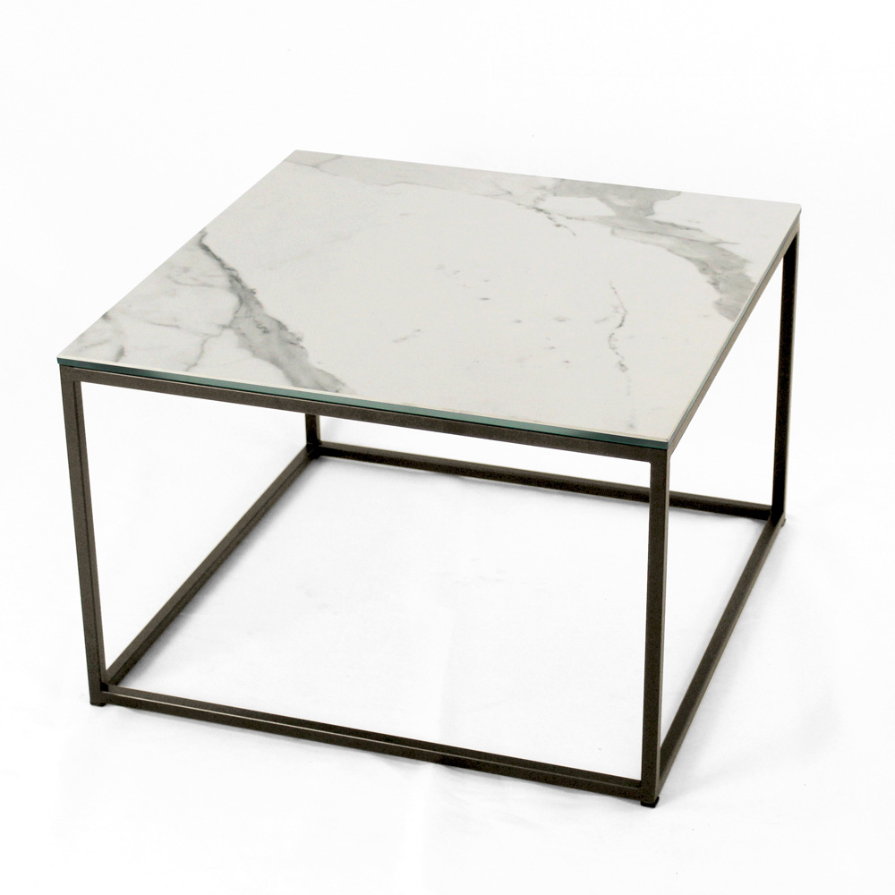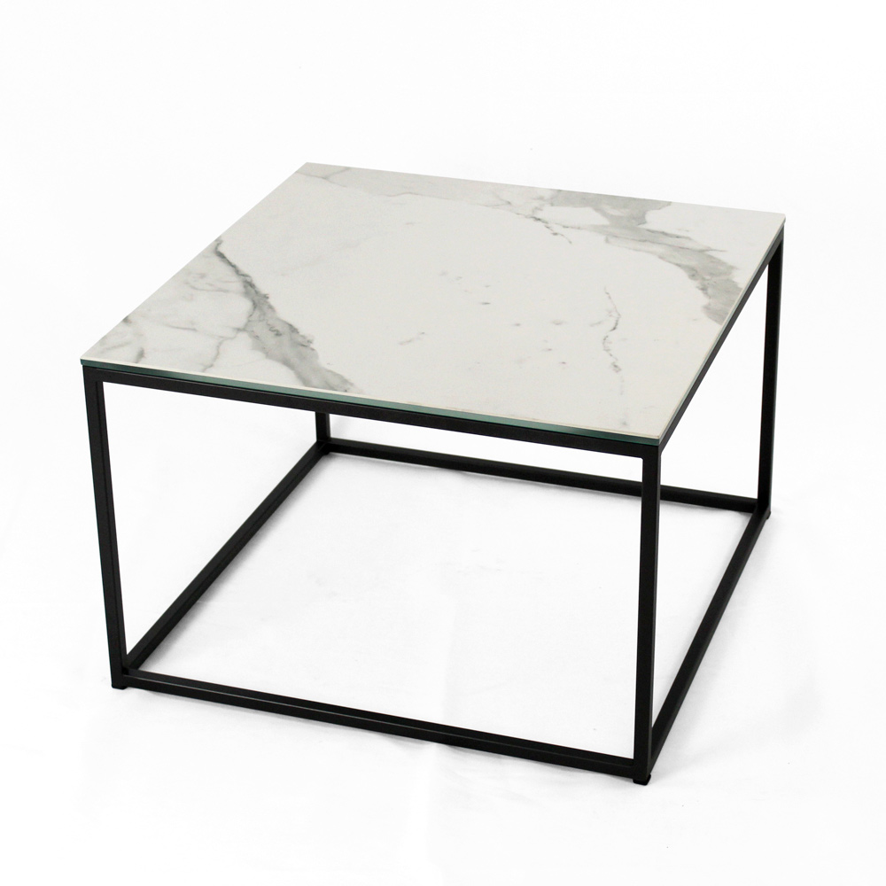 Kwadratowy stolik kawowy z malowaną stalową podstawą i blat z 3-milimetrowej matowej, żyłkowanej białej kamionki laminowanej 6-milimetrowym szkłem float. Stoliki kawowe w nowoczesnym stylu stanowią idealny mebel do uzupełnienia dekoracji każdego salonu i pokoju dziennego. Produkty te są wyjątkowe, eleganckie i jednocześnie funkcjonalne dzięki prostym i harmonijnym wykończeniom, które sprawiają, że pasują do każdej potrzeby i okazji użytkowania. Materiały użyte do budowy gwarantują doskonałą jakość i wytrzymałość nawet z upływem czasu.