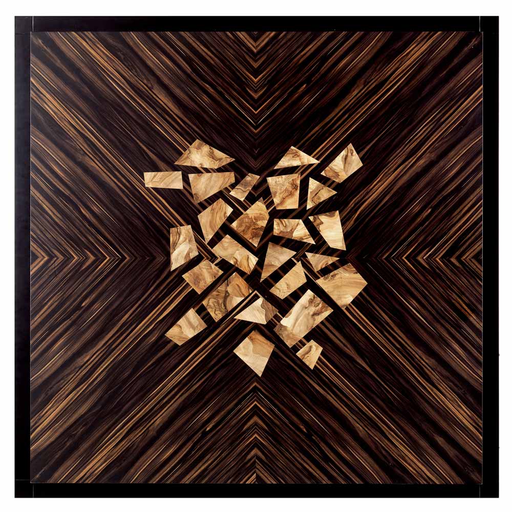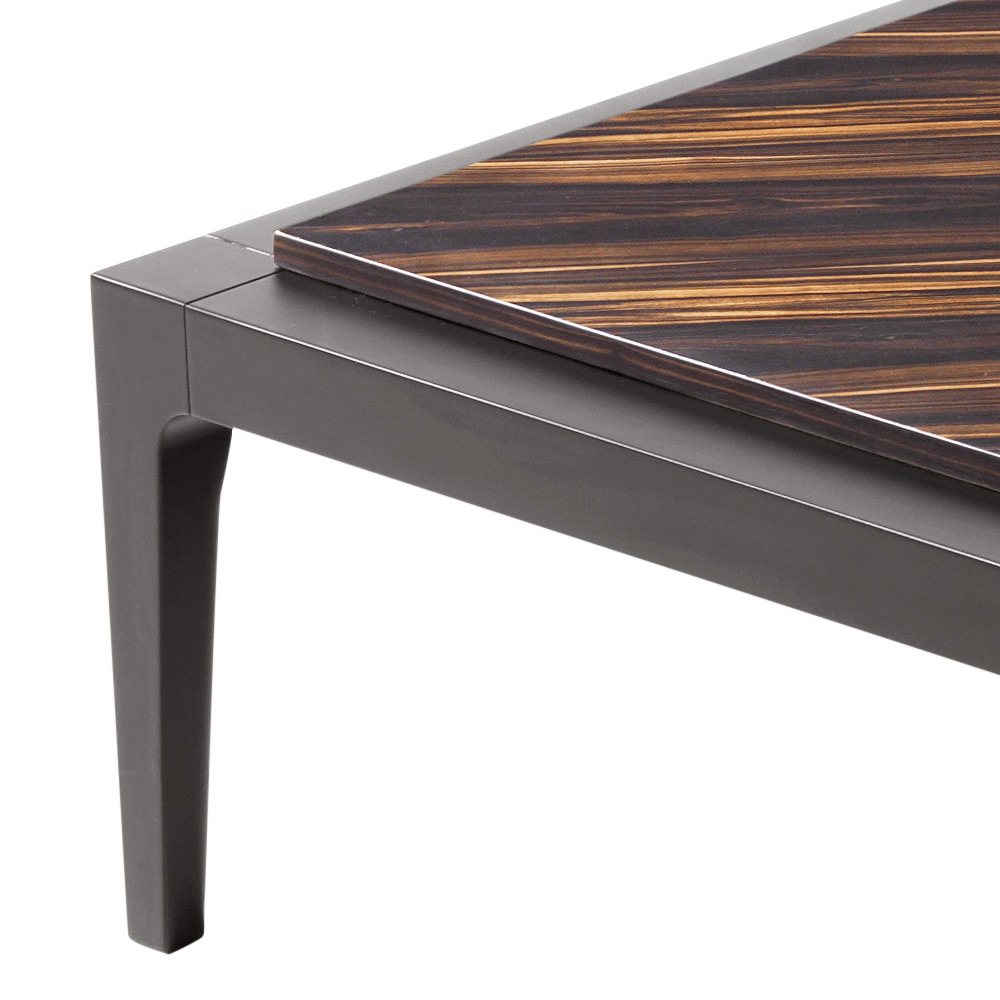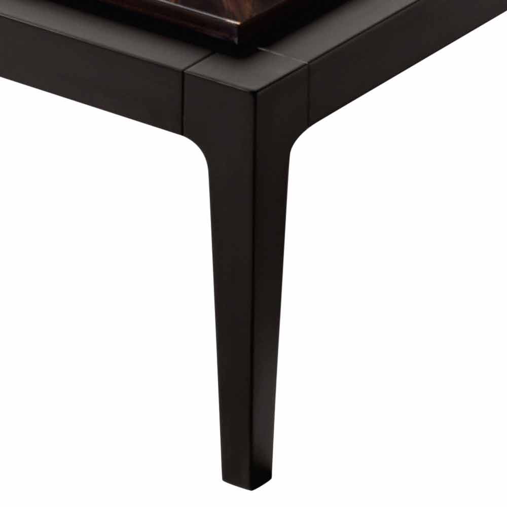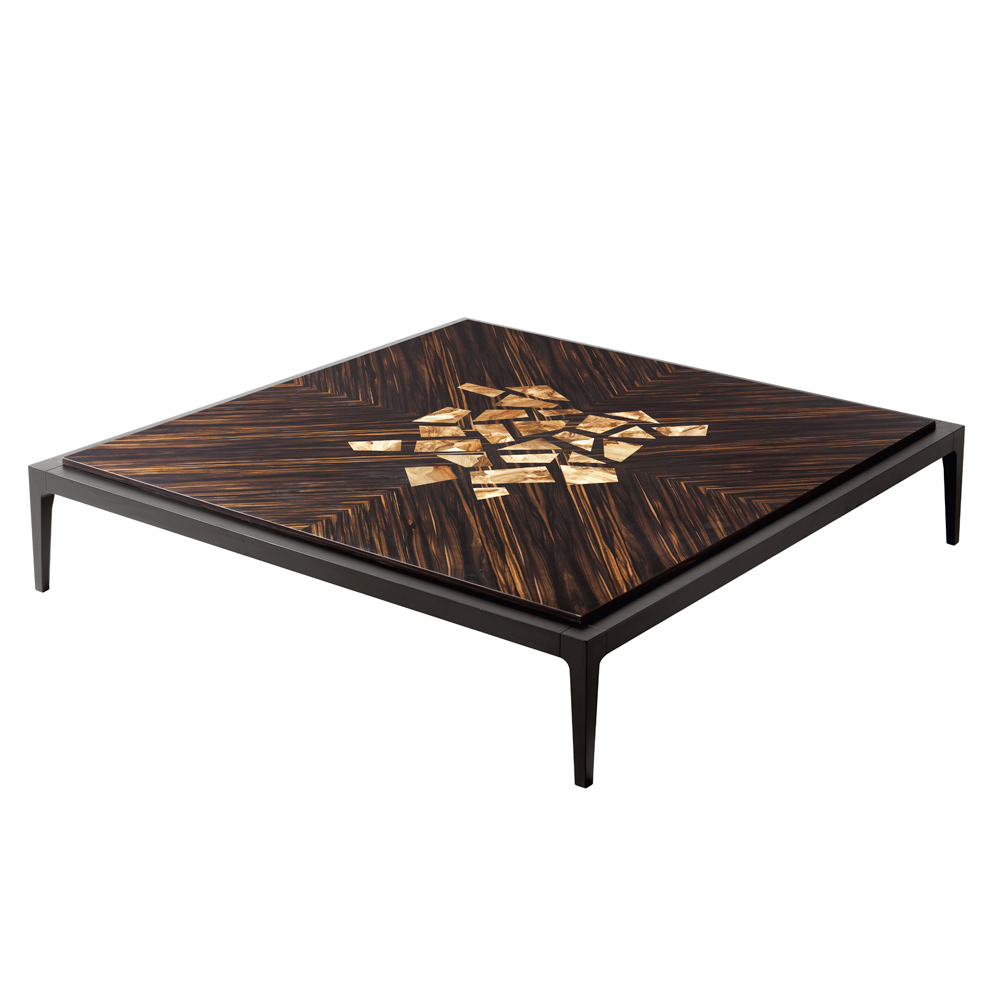 Stolik kawowy Zarafa ma solidną strukturę z drewna lipowego, fornirowany top z fornirem z hebanu i wstawkami z kolendry w orzechowym drewnie orzechowym.