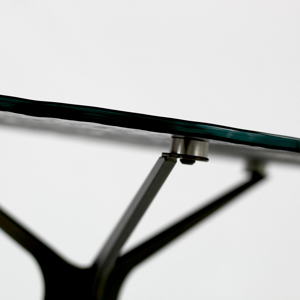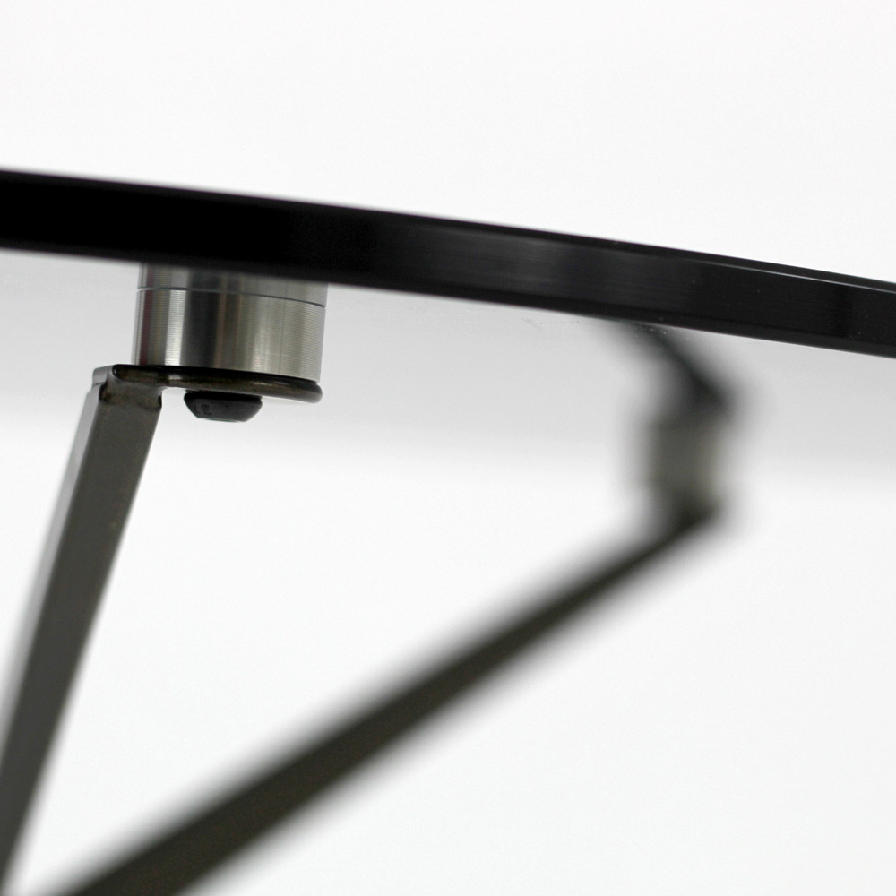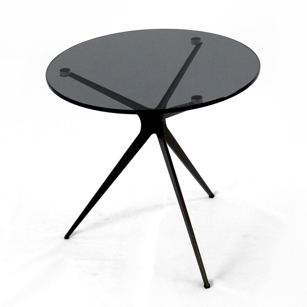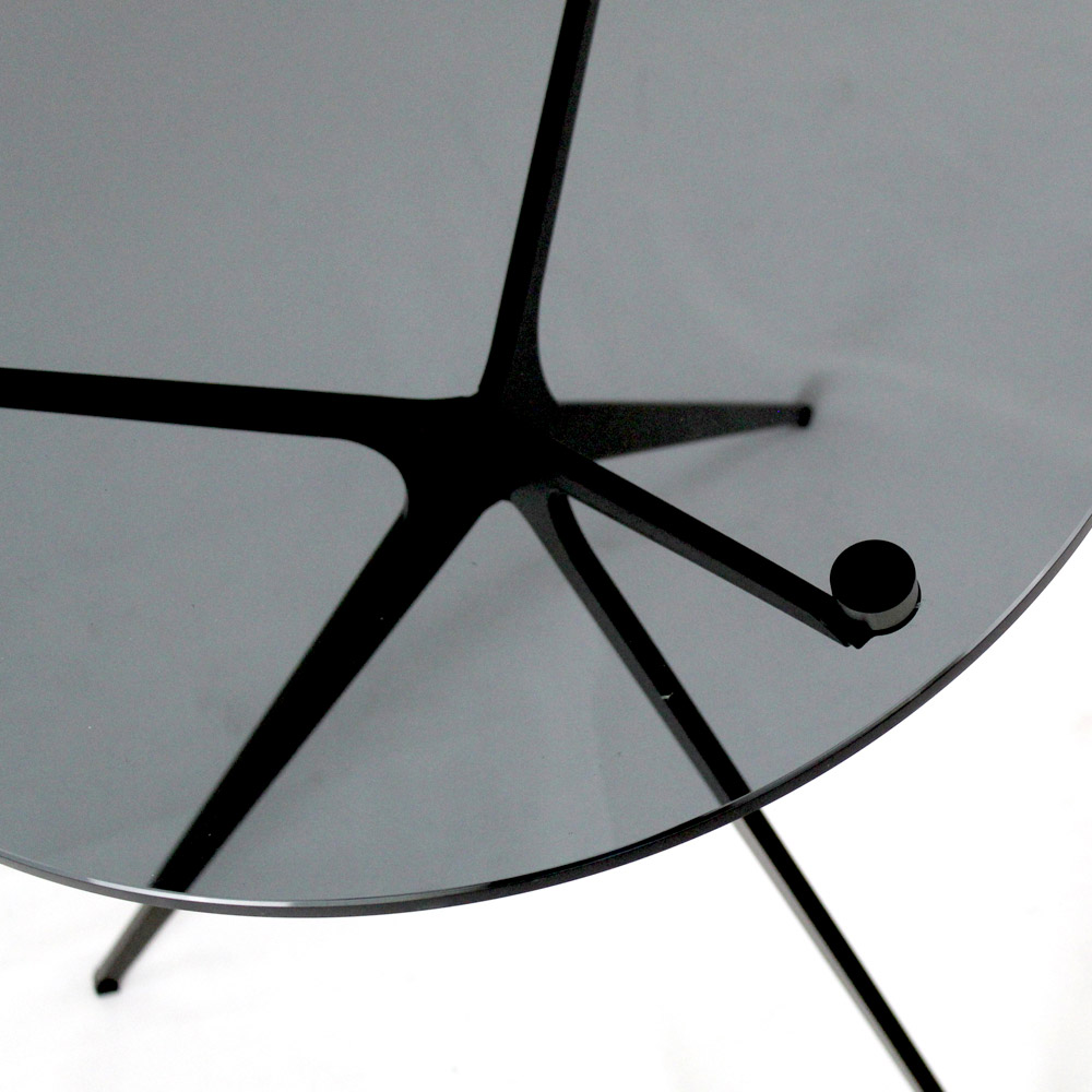 Okrągły stolik kawowy z malowaną stalową podstawą i szklany blat.