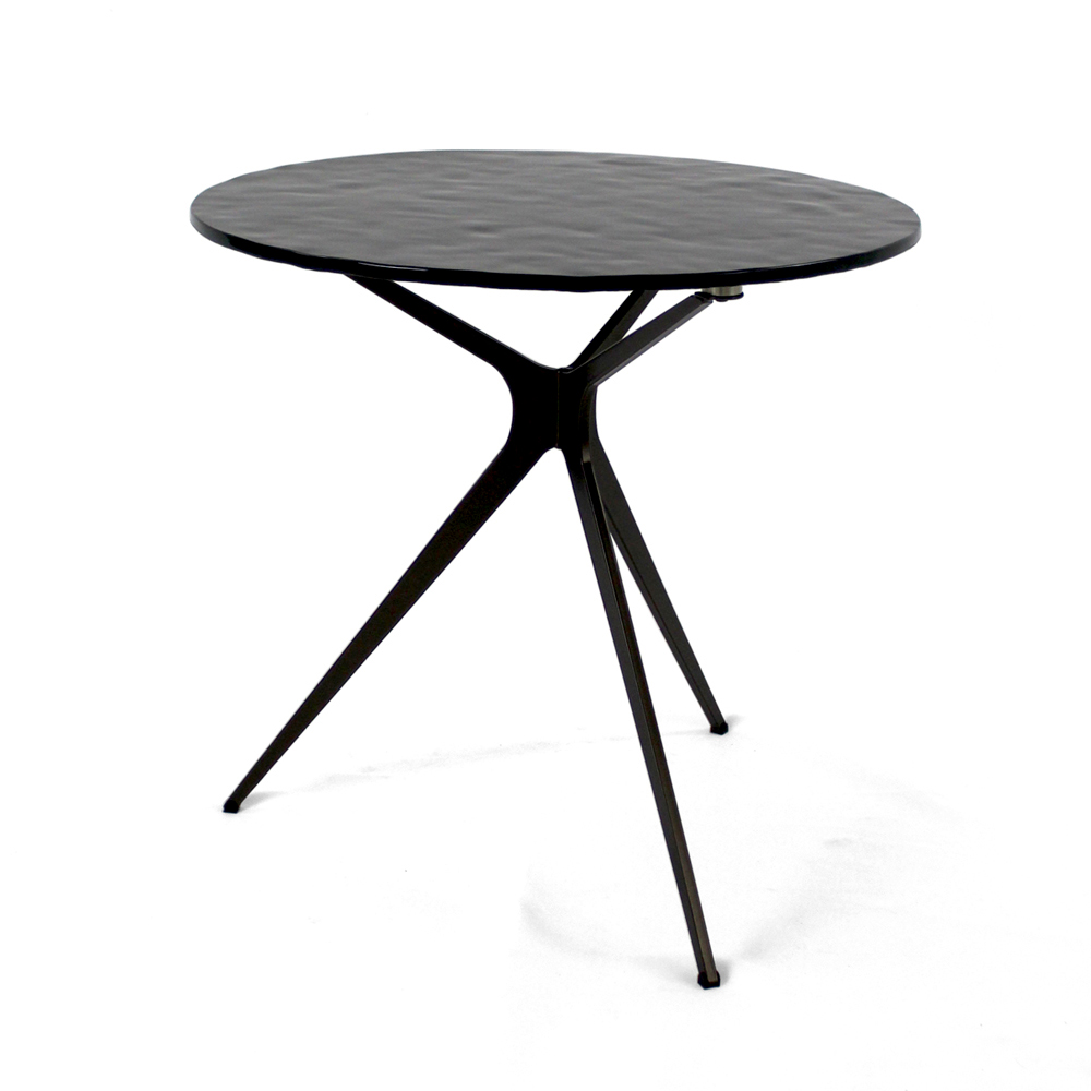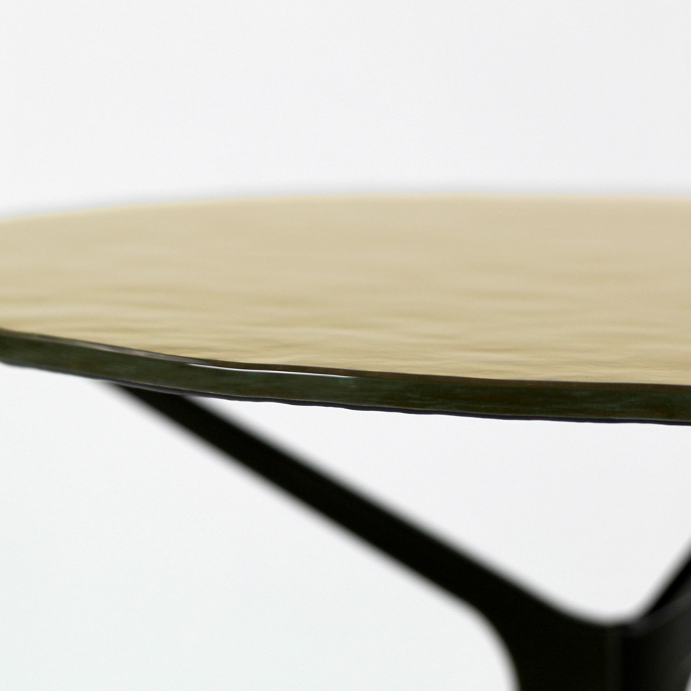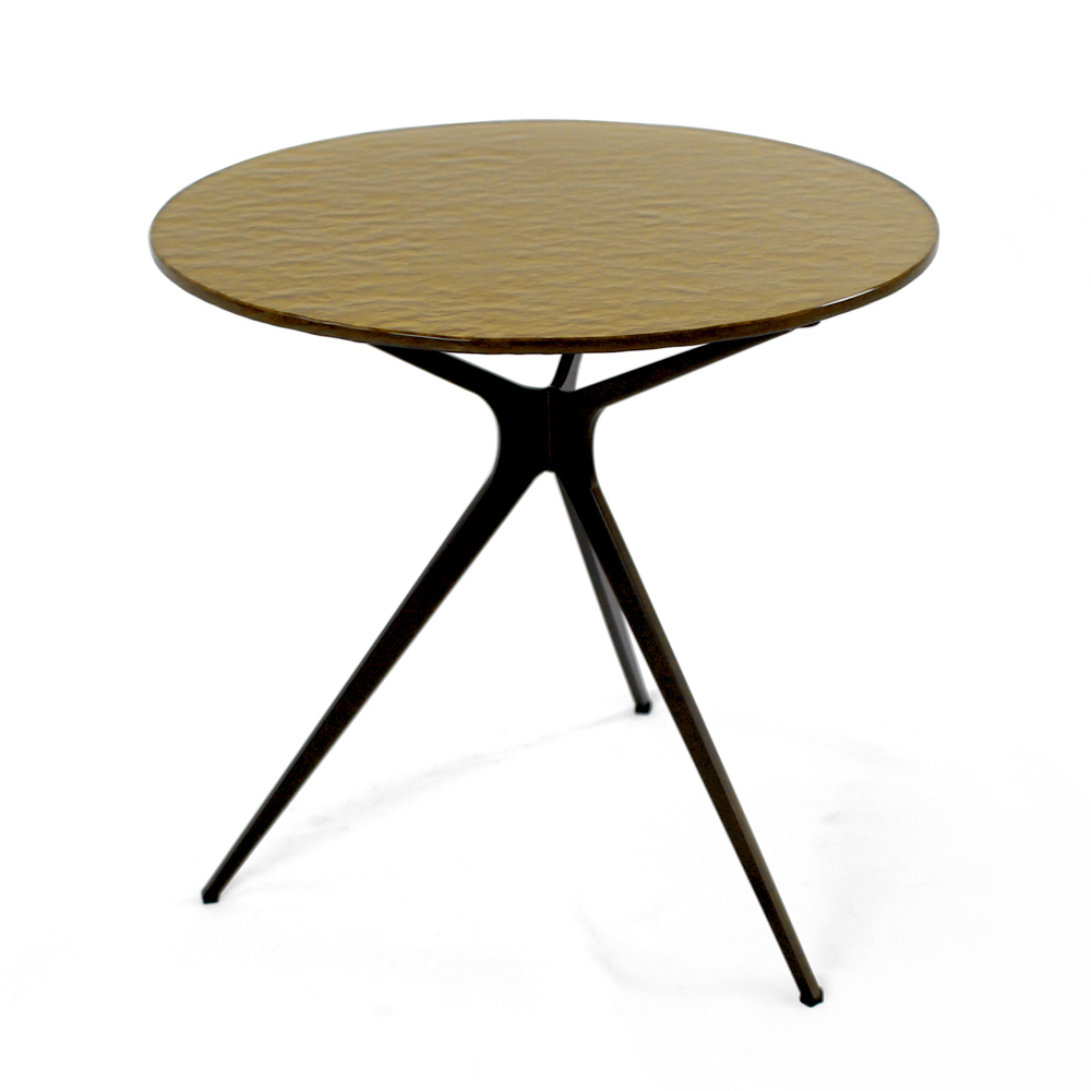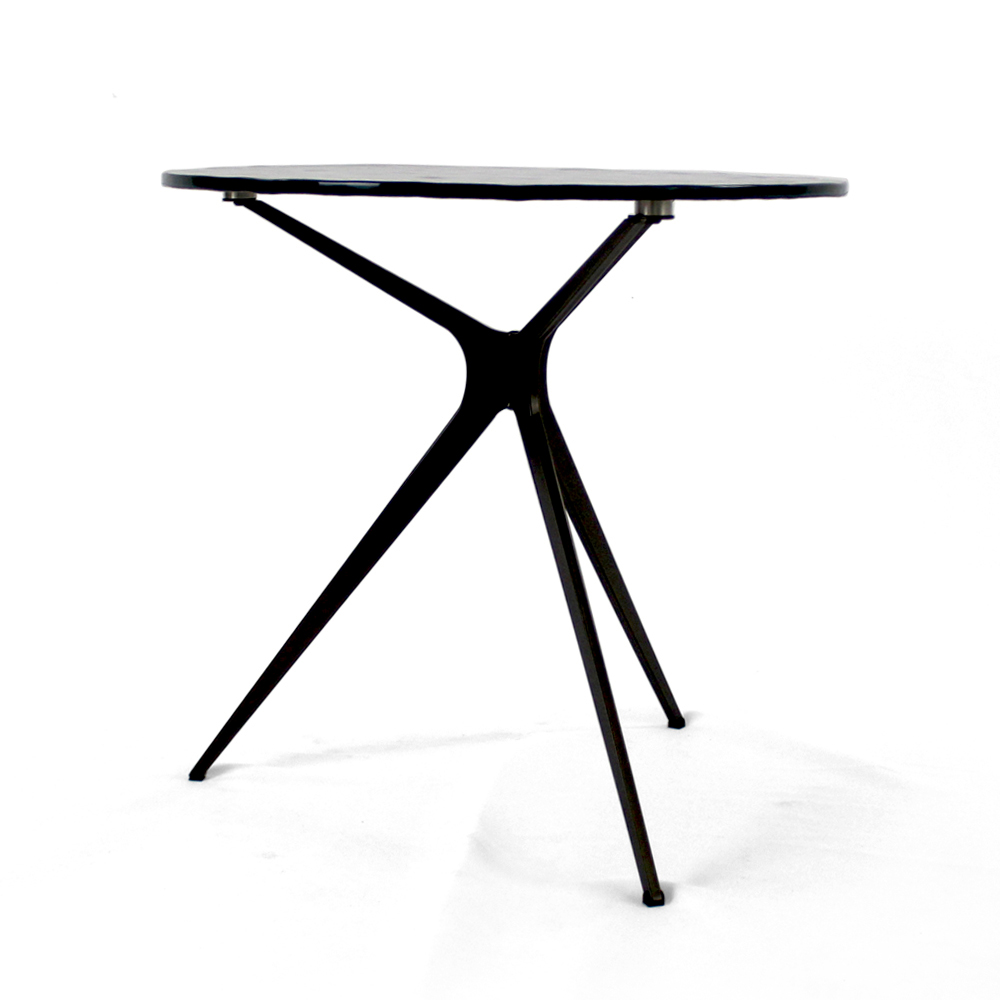Okrągły stolik kawowy z malowaną stalową podstawą i szklany blat.