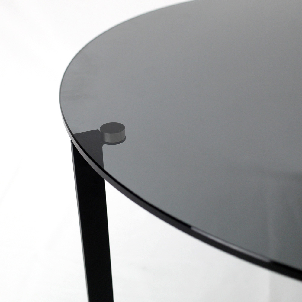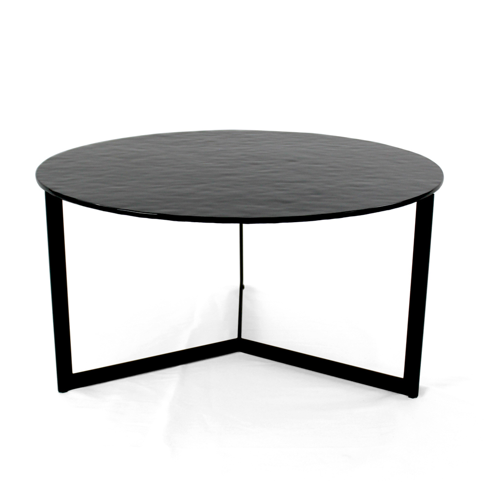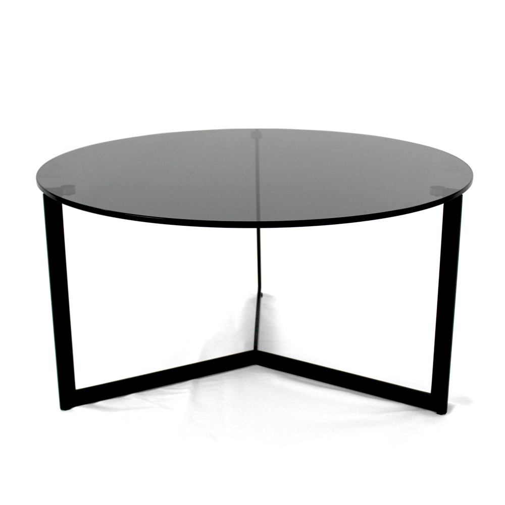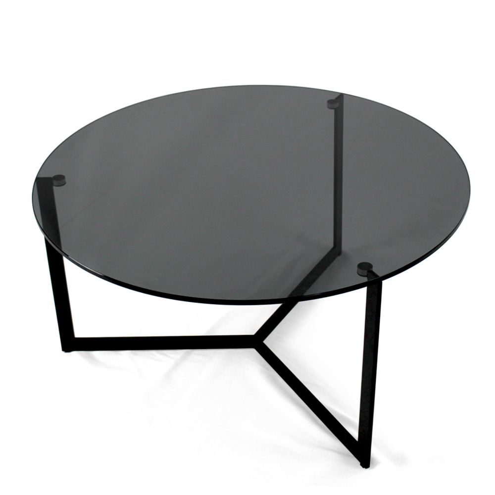 Okrągły stolik kawowy z podstawą z malowanej stali i szklanym blatem.