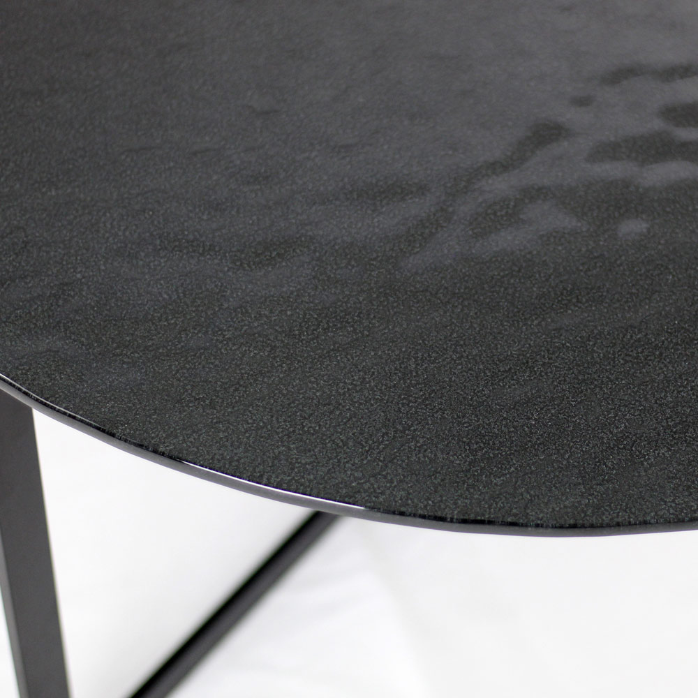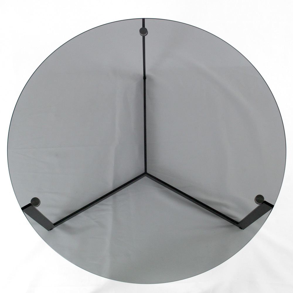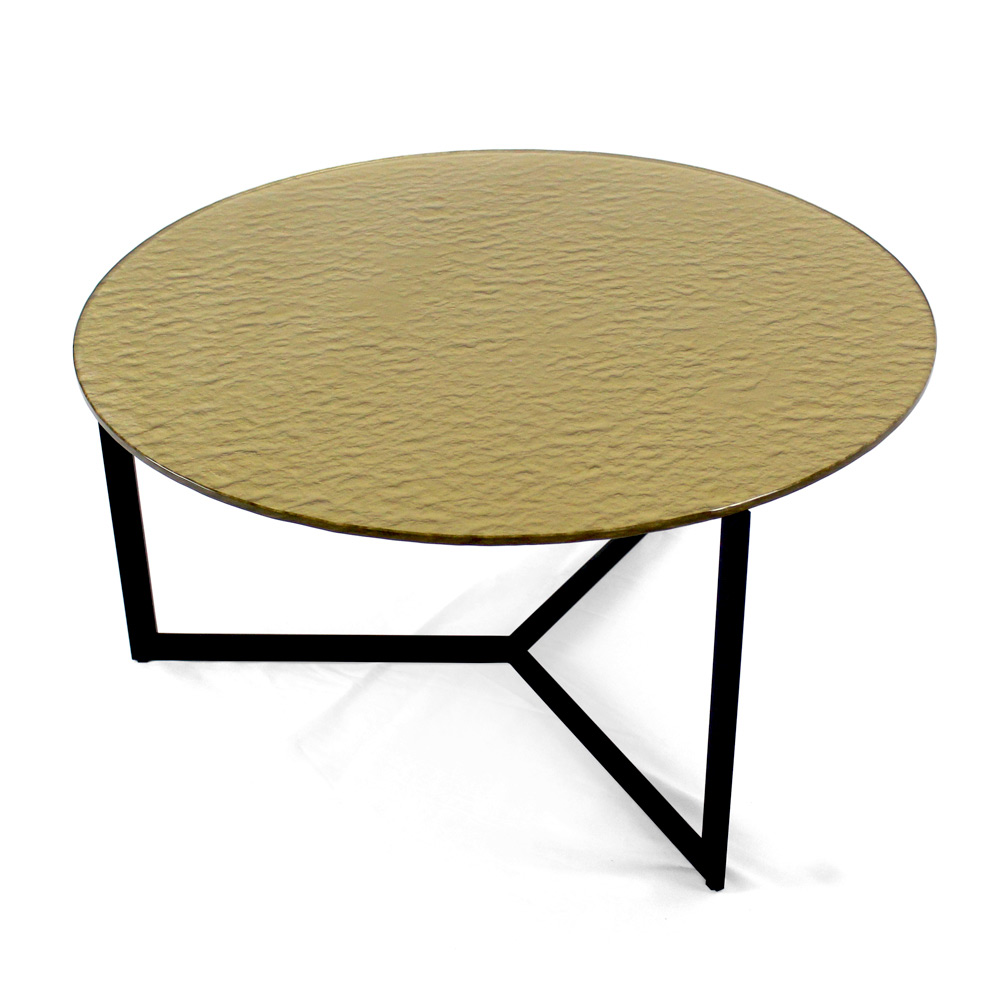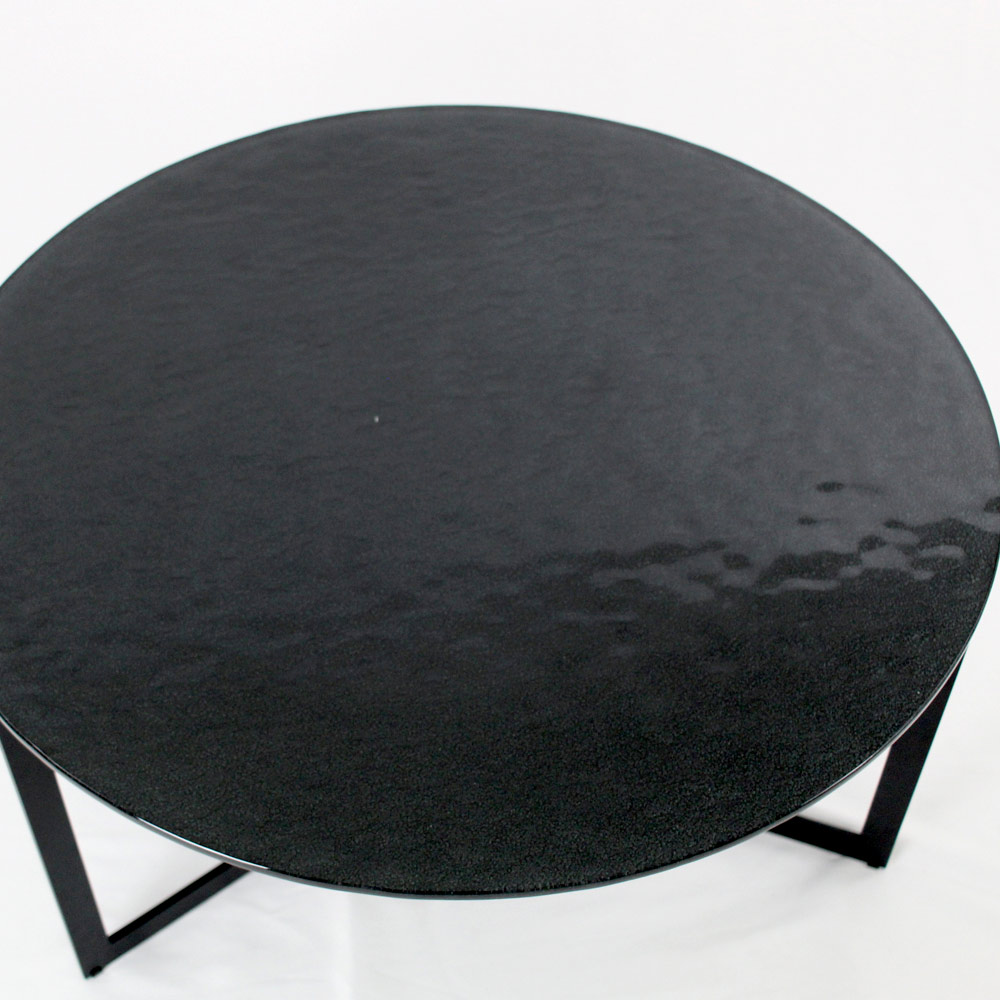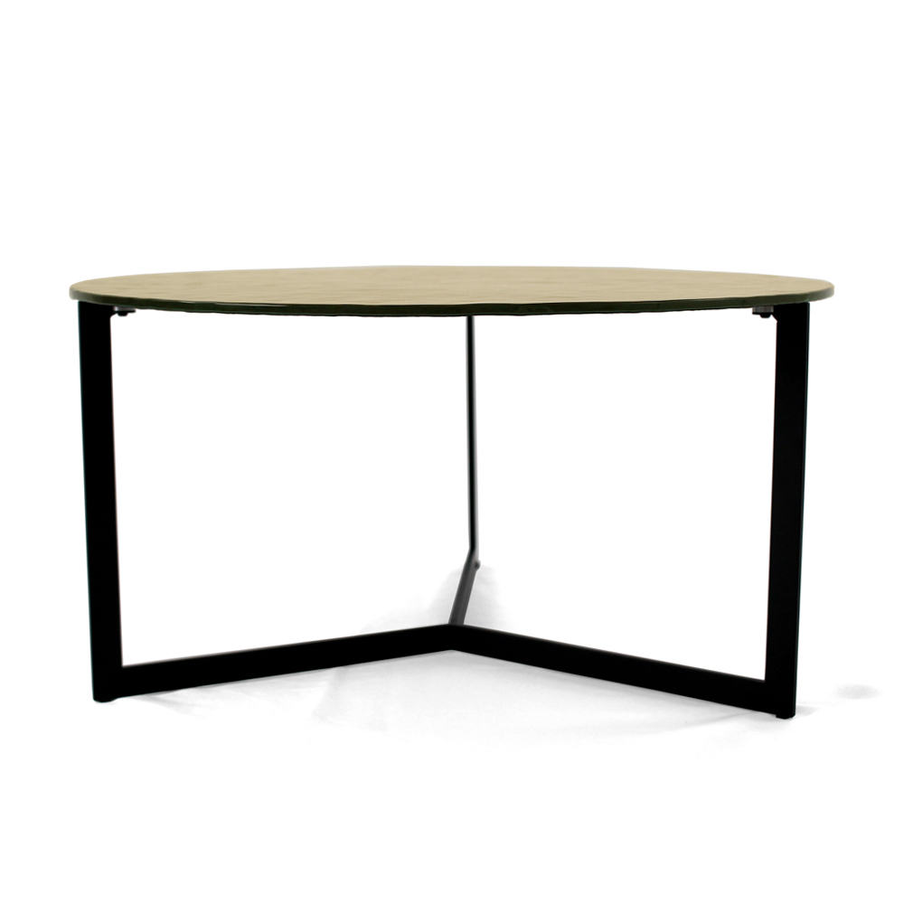 Okrągły stolik kawowy z podstawą z malowanej stali i szklanym blatem.