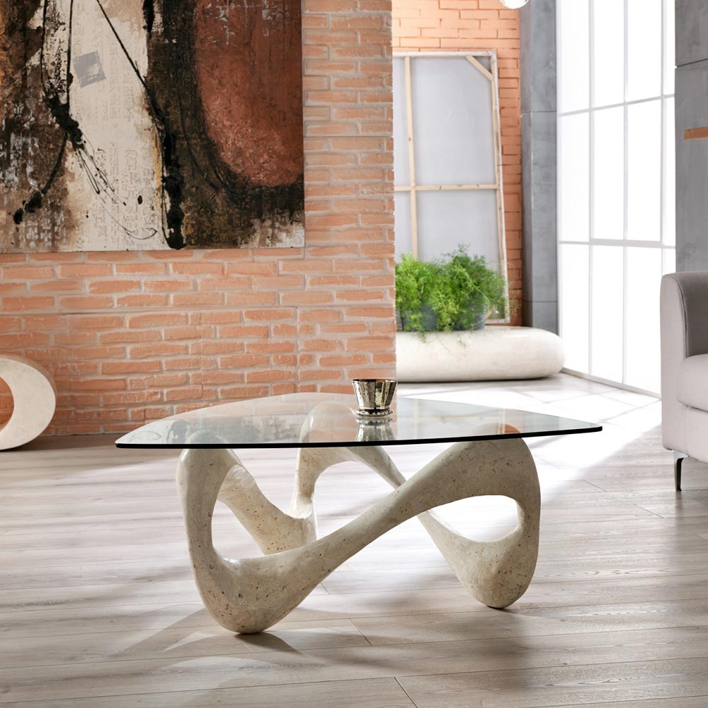 Stolik kawowy z kamienia Fossil ze szklanym blatem.