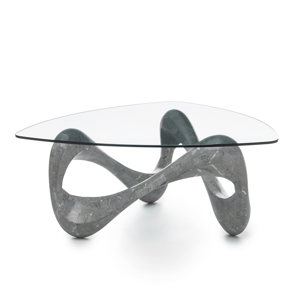 Miękkie, kręte i nieregularne linie tworzą konstrukcję tego oryginalnego stolika kawowego, uzupełnionego odpornym, przezroczystym, trójkątnym, polerowanym brzegiem, szklanym blatem o grubości 10 mm.