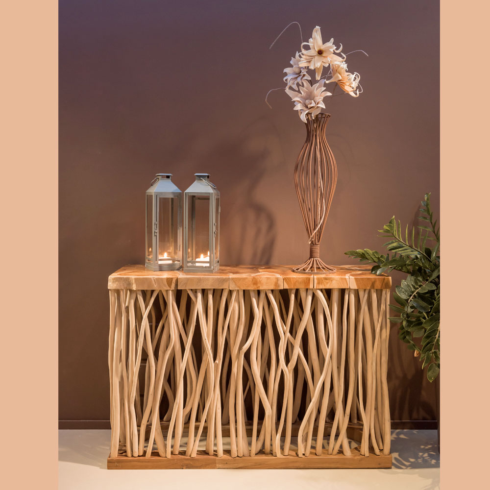 Ten stolik konsolowy z naturalnego drewna tekowego to efektowny mebel, charakteryzujący się oryginalnym i fakturowanym designem. Blat i nogi z naturalnego drewna tekowego tworzą wyjątkowy, efektowny efekt, idealny do przedpokoju, salonu lub innego eleganckiego wnętrza.