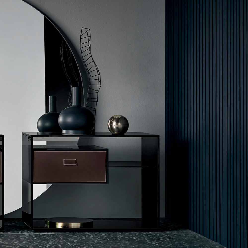 Ten stolik lub stolik nocny do sofy charakteryzuje się uniwersalnym , eleganckim i minimalistycznym designem w całości wykonanym z przydymionego szkła z lustrzaną podstawą.