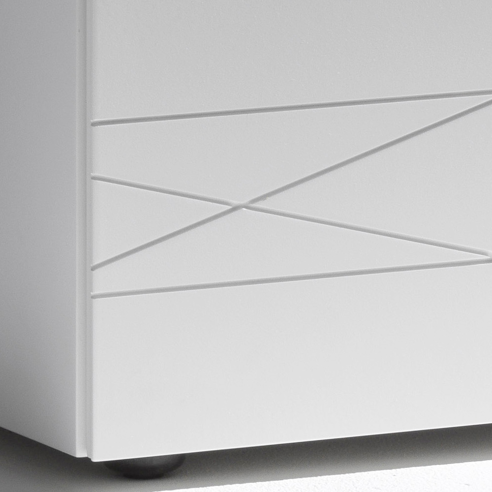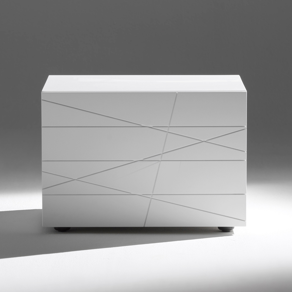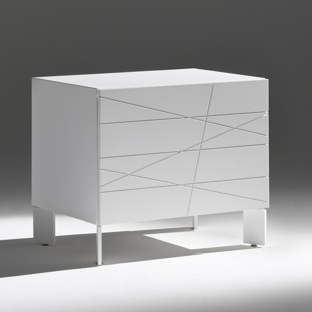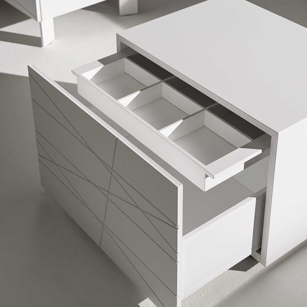 Rama wykonana jest z malowanej płyty wiórowej , a front szuflady z płyty MDF wykończony jest farbami poliuretanowymi , co zapewnia trwałą, jednolitą i wysokiej jakości powierzchnię. Grawerowany wzór na froncie tworzy wyrafinowany efekt graficzny, nadając meblowi indywidualny charakter, nie obciążając jego linii.
