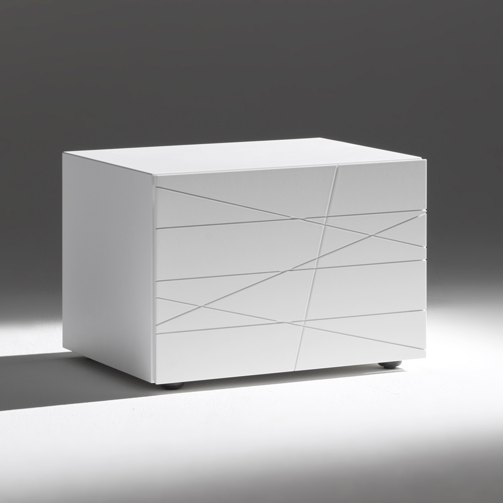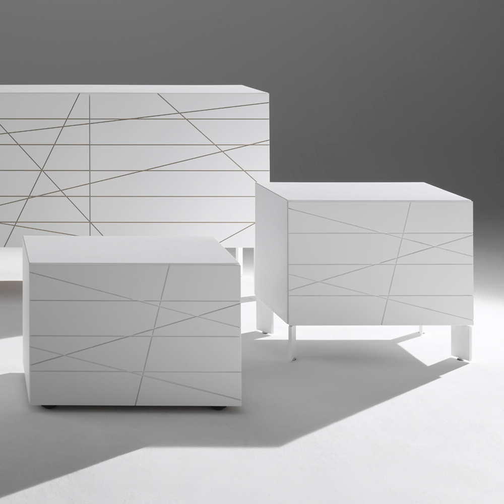 Doskonale sprawdza się jako designerski stolik nocny , naturalnie wpasowuje się w nowoczesne, minimalistyczne i współczesne konteksty, wzbogacając otoczenie stonowanym i wyrafinowanym graficznym akcentem.