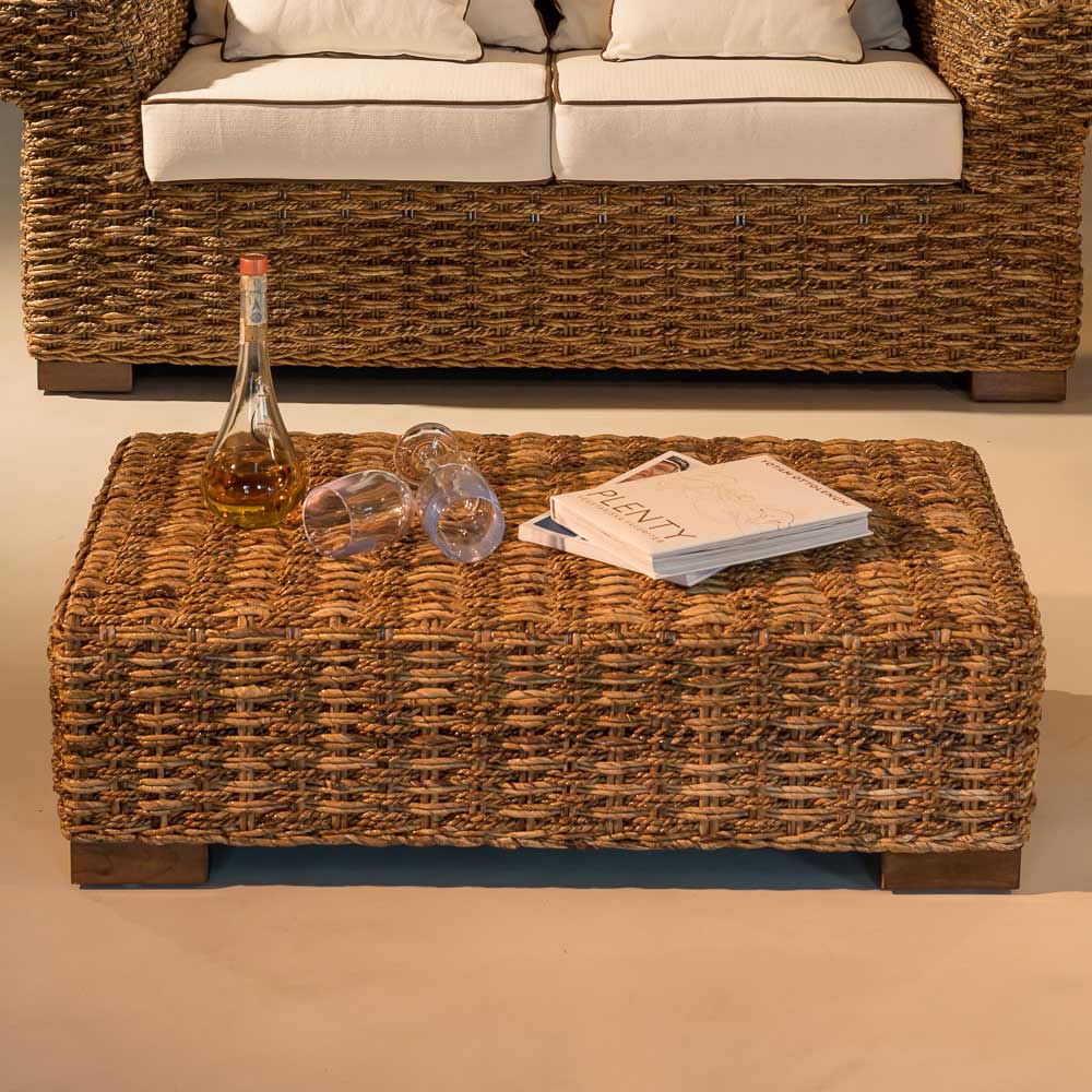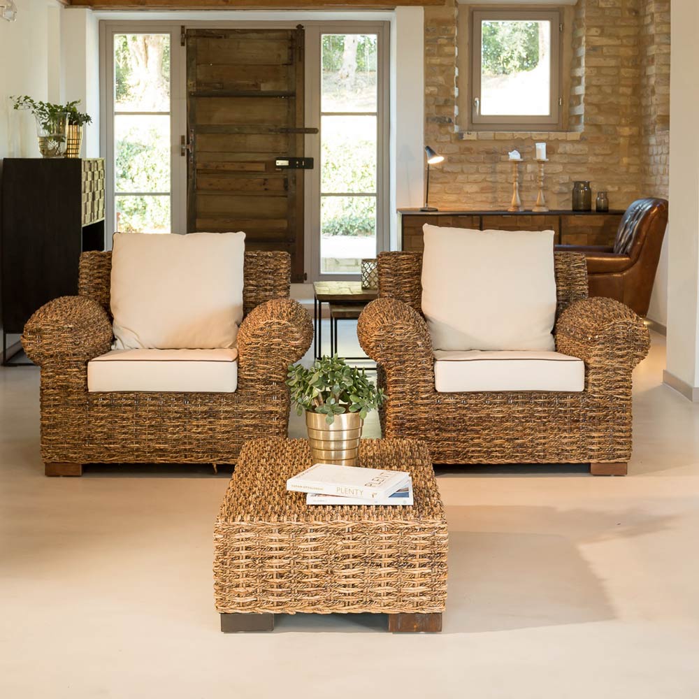 stolik kawowy należy do całej kolekcji, którą wyróżniają zaokrąglone cylindryczne podłokietniki oraz wyrafinowany gęsty splot naturalnego włókna abaki, pozyskiwanego z drzewa bananowego. Siedziska są duże i wyposażone w wygodne poduszki.