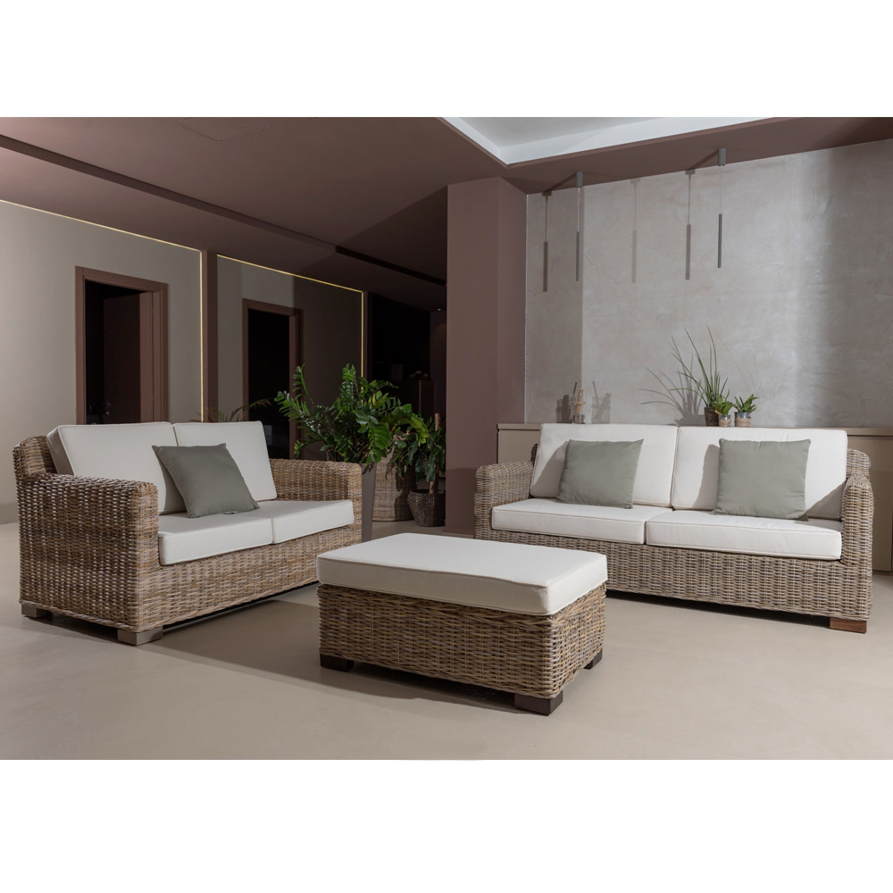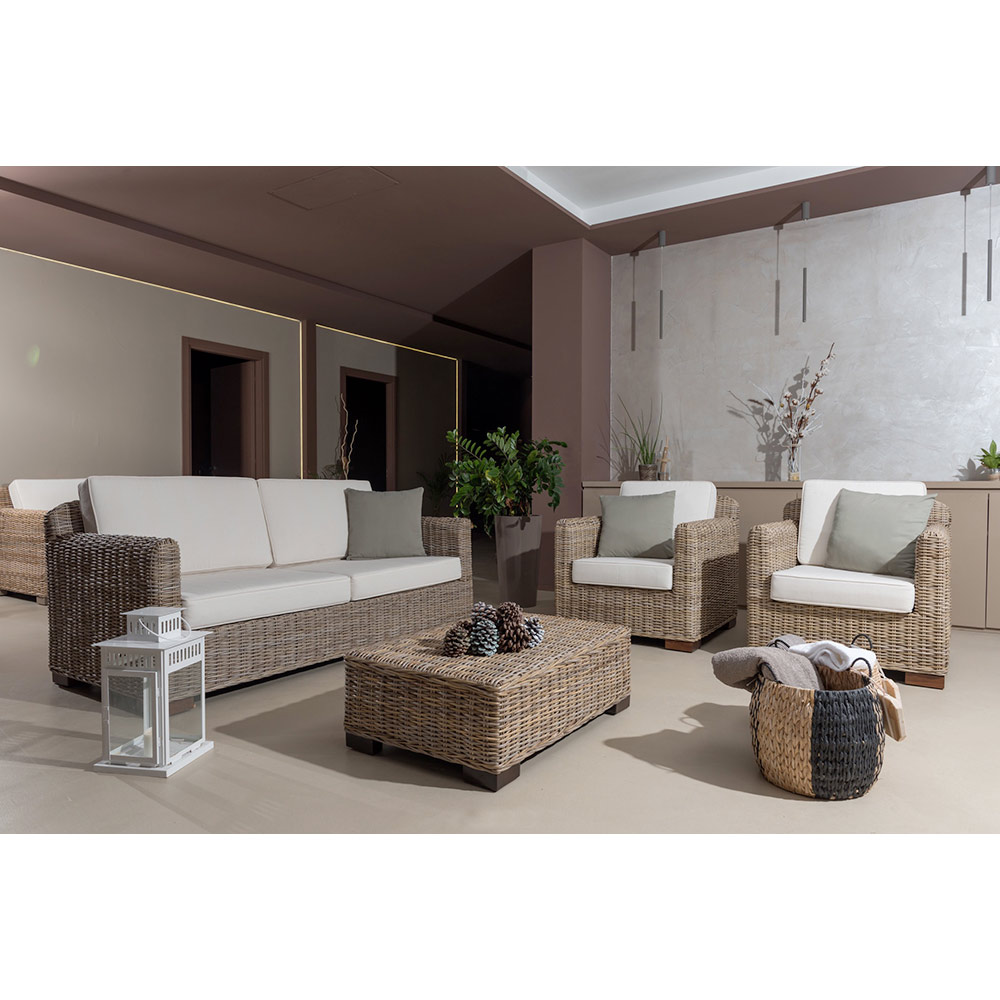 Stolik kawowy, który można przekształcić w pufę zewnętrzną wykonaną z ręcznie tkanego szarego kubu ze standardową poduszką w zestawie w standardowym wykończeniu " Ecru ". Kubu to naturalny materiał należący do najbardziej odpornych spośród tych, które można znaleźć w przyrodzie, ale który zawsze pozostaje bardzo lekki.
