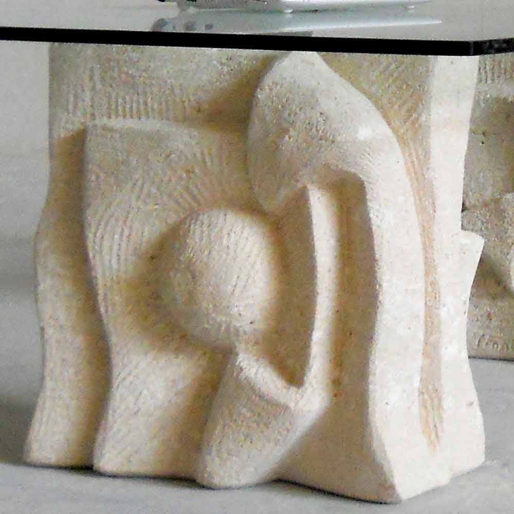 Wykonany we Włoszech, z podwójną podstawą z naturalnego kamienia Vicenza,wyrzeźbione ręcznie z litego bloku, ze szklanym blatem o grubości 15 cm, przymocowane do podstawy za pomocą wyjmowanego stalowego kołnierza.