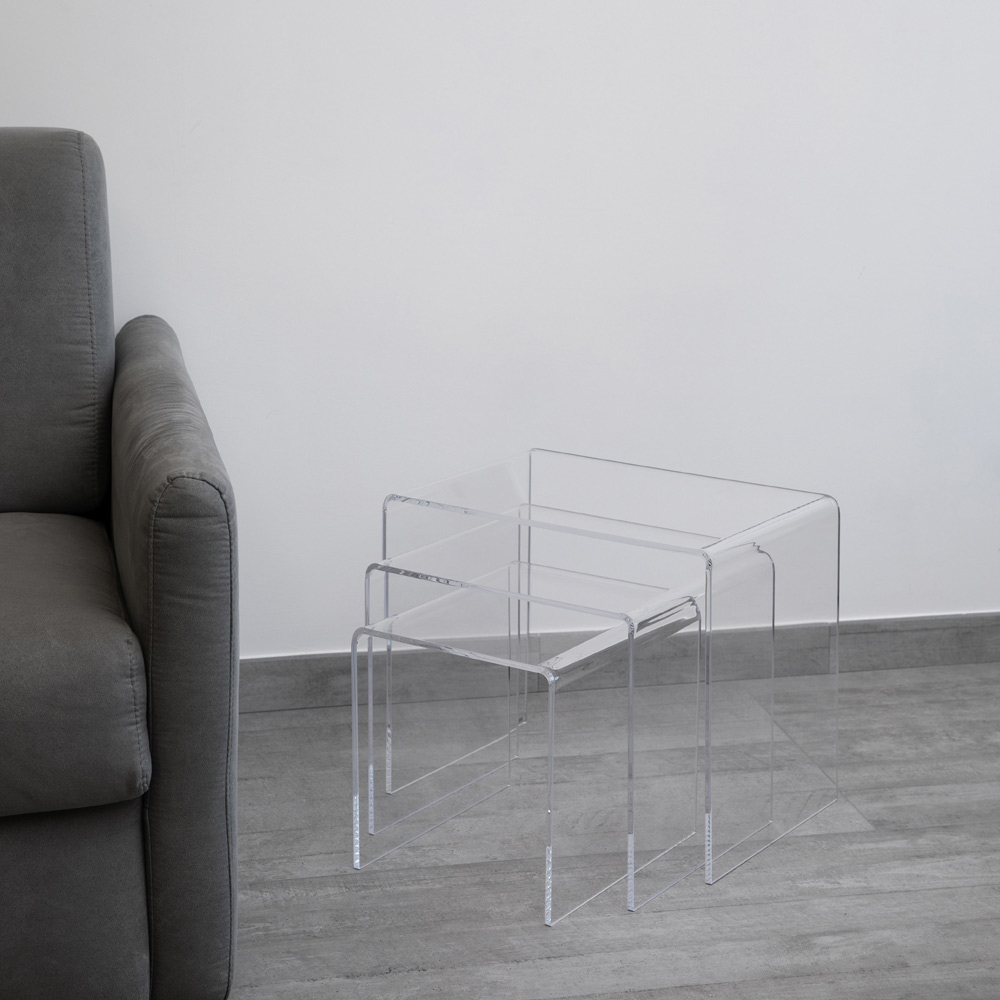 Tryptyk Stoliki kawowe z przezroczystego kryształu akrylowego, wyprodukowane we Włoszech.