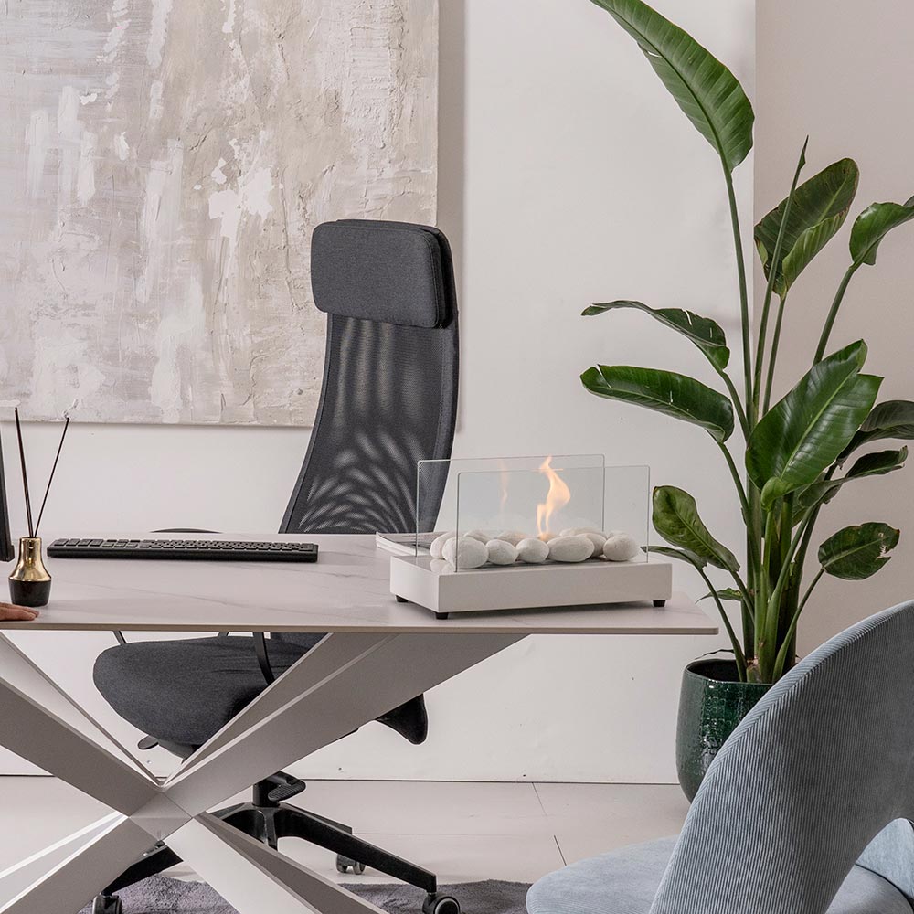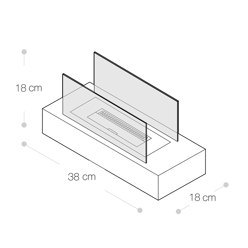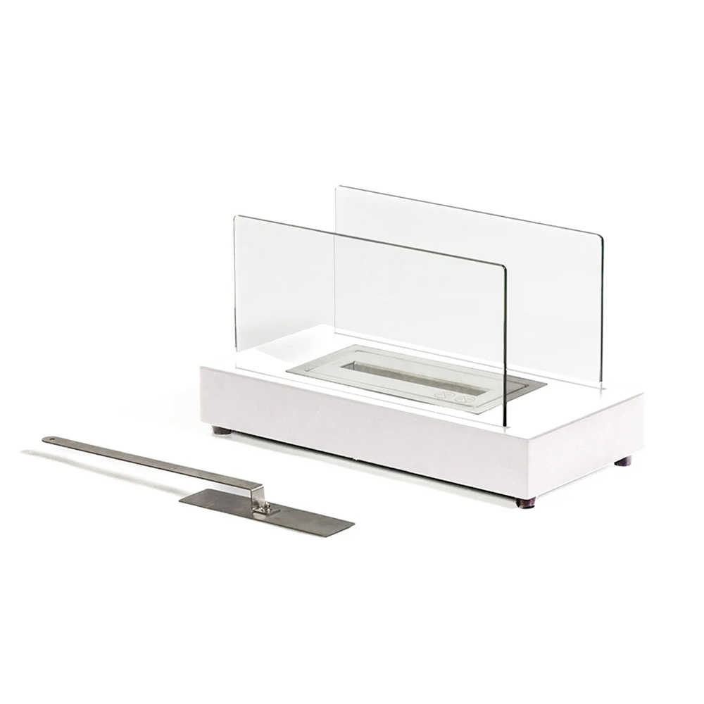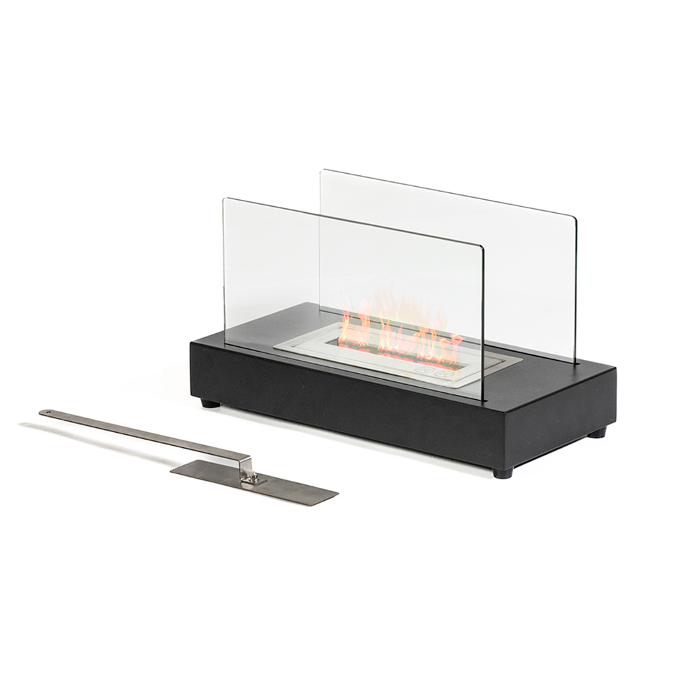 Konstrukcja wykonana jest z metalu, a hartowane szkło chroni płomień przed ewentualnymi podmuchami wiatru, podkreślając go; dzięki temu nadaje się również do zastosowań zewnętrznych.