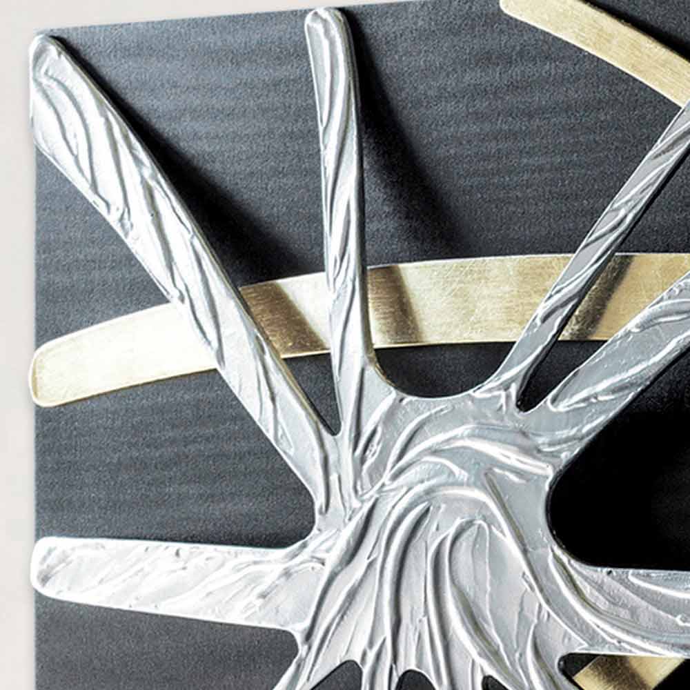 Zakrzywione struktury nakładające z ceramicznego materiału, ręcznie zdobione złoto i srebro na płótnie lakierowane na czarno, błyszczące wykończenie.
