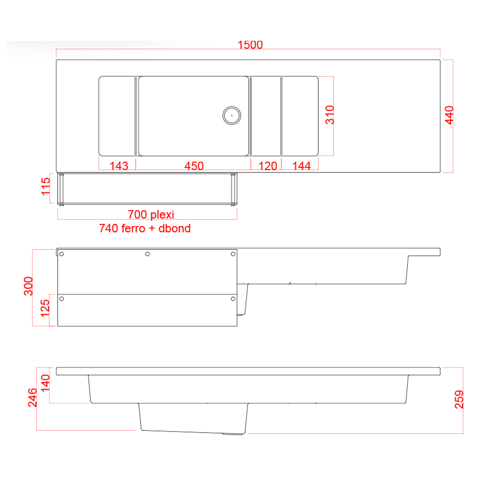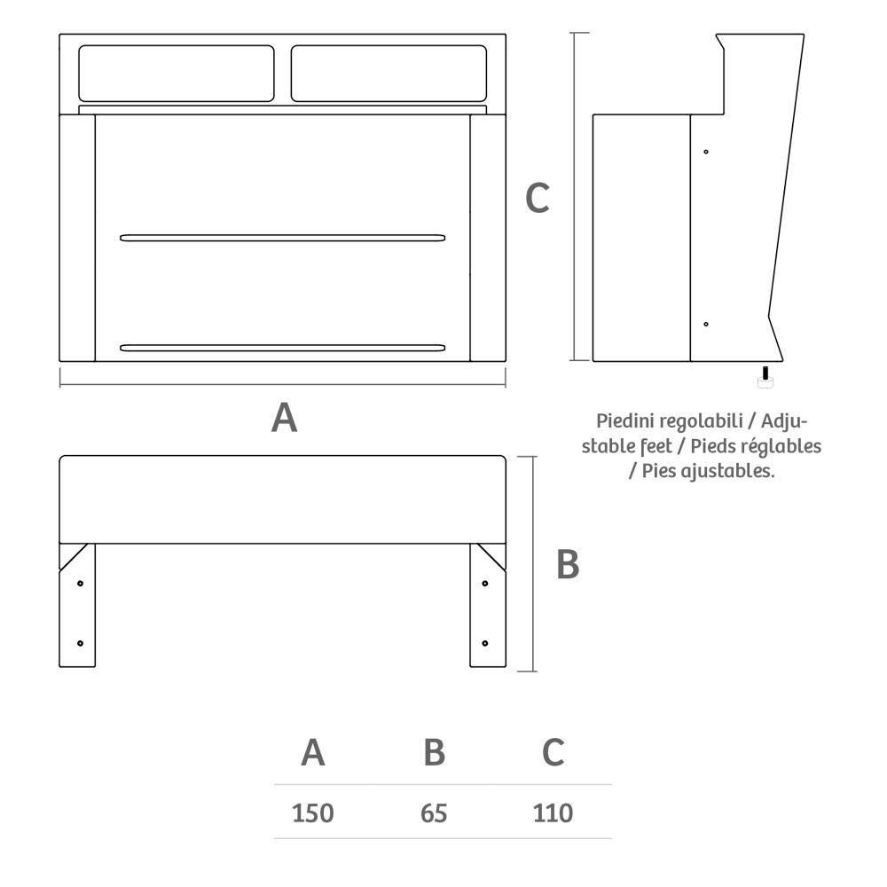 Wymiary:- Blat: wysokość 110 cm x głębokość: 65 cm x długość: 150 cm