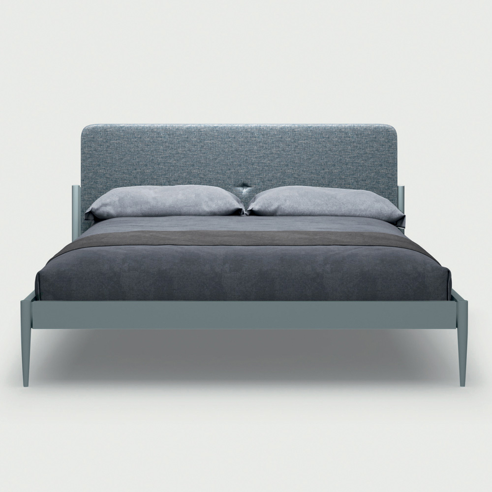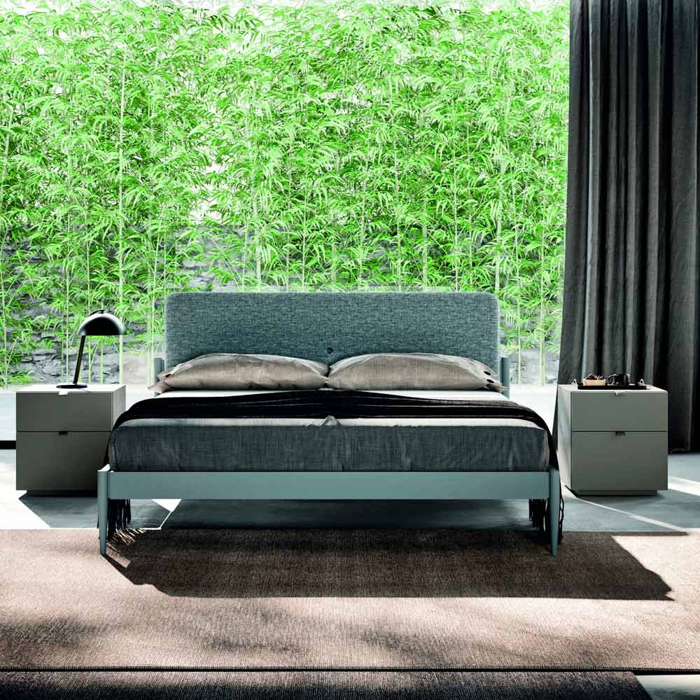 ramą łóżka i nóżkami z matowego lakierowanego drewna i zagłówkiem pokrytym tkaniną, 2 szafki nocne z 2 szufladami każda i komodę z 4 szufladami z matowego lakierowanego drewna tytanowego pokrytego