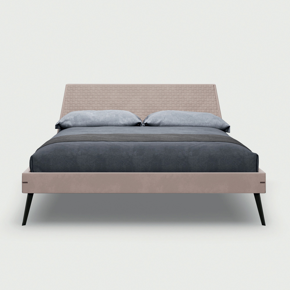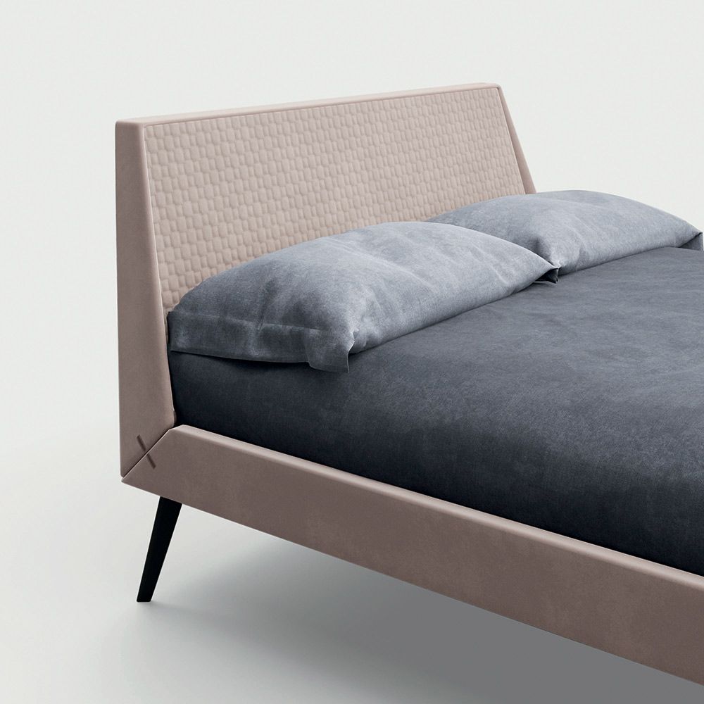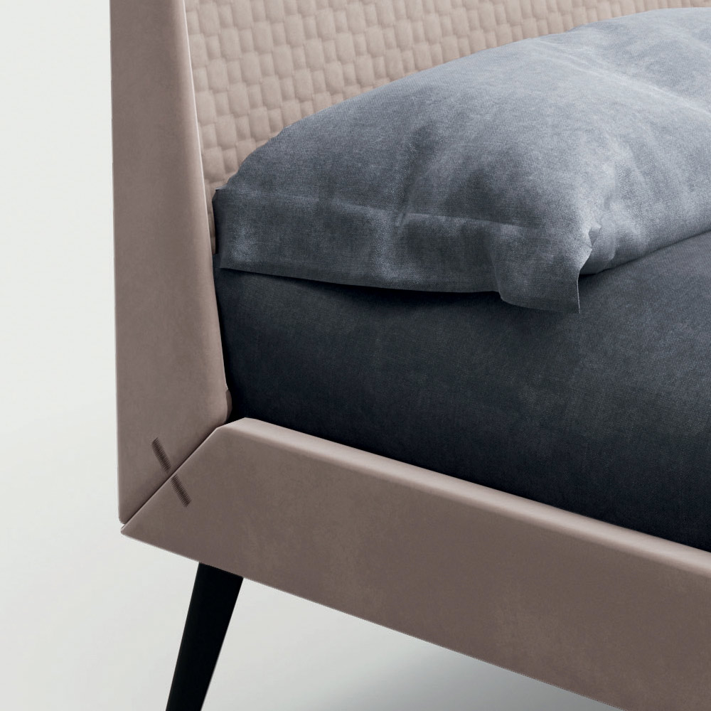 naturalnego komfortu formy i funkcji . Łóżko podkreślają dwa różne poziomy wyściełania, które łączą się w zagłówku, który z kolei jest połączony z podstawą ozdobioną wspaniałymi przeszyciami, które upiększają jego kształty. Elementy dopełniające kompozycję wzbogacają estetykę sypialni o