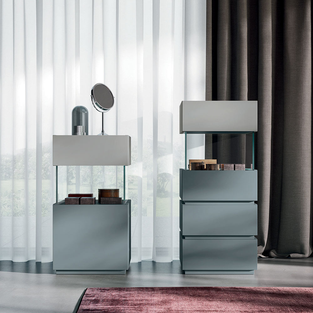 blatem z białego marmuru , modułową szafkę nocną (2 modułowe elementy) z drewna lakierowanego mgłą i węgla materiał. z blatem z białego marmuru i obrobionym frontem szuflady, dwie wysokie komody z drewna lakierowanego mgłą i piórami ze szklaną witryną, komoda z 5 szufladami (składająca się z 4 elementów modułowych) z drewna z wykończeniem w kolorze grafitowym i matowym lakierem mgły z 2 szufladami z obrobionym frontem i biały marmurowy blat i