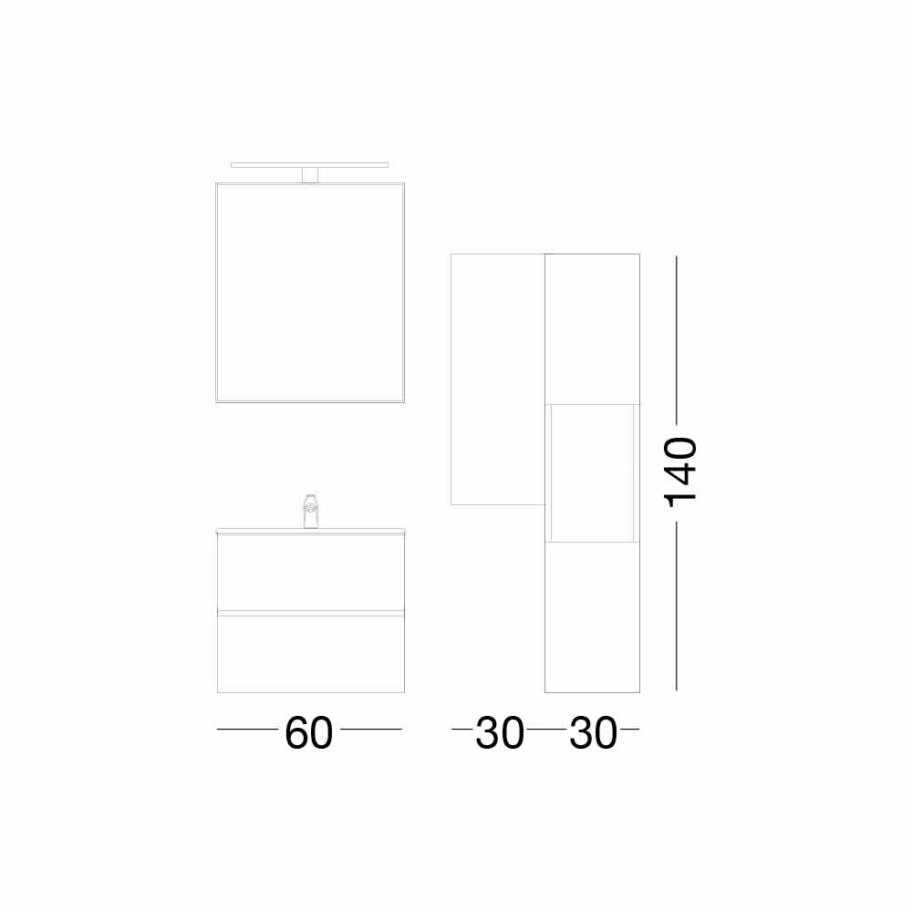 Szafka łazienkowa 60 cm, designerska umywalka, lustro, kolumna i meblościanka.