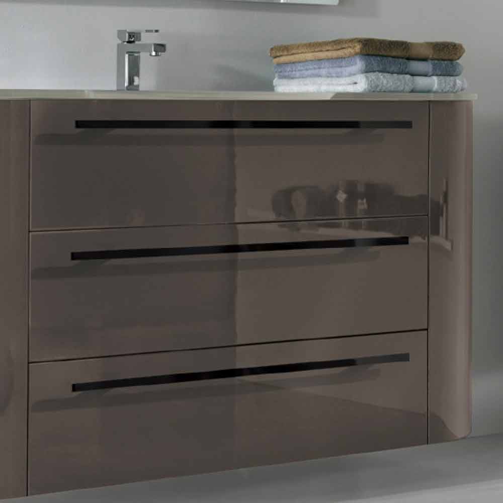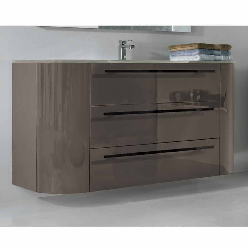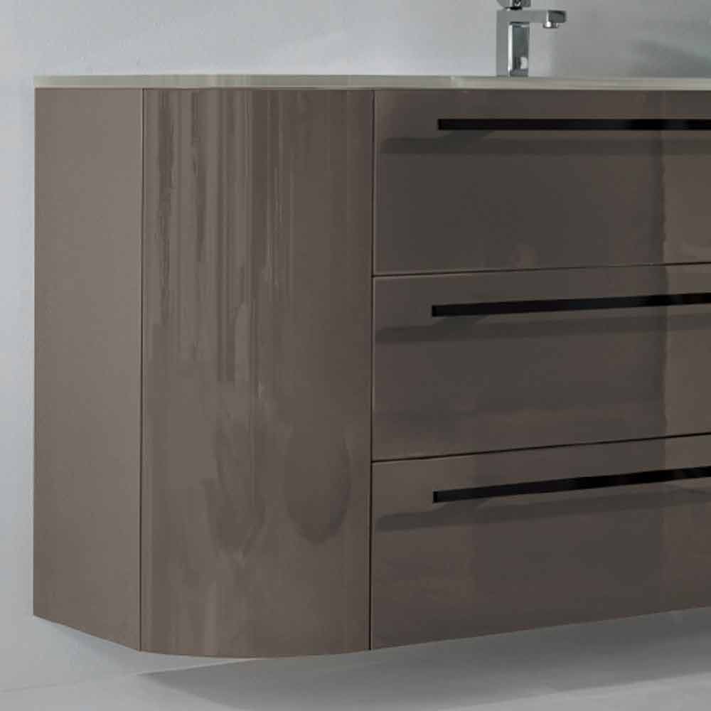 Umywalka do basenu o nowoczesnym designie składająca się z 3 wyjmowanych szuflad cm. 96 plus 2 zaokrąglone drzwi boczne cm. 24 caduna; chromowane uchwyty. Błyszczące lakierowane wykończenie drewna dostępne w różnych kolorach. Szklany blat ze zintegrowanym zlewem.