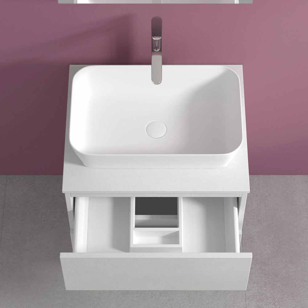 Podwieszane meble łazienkowe mają czysty i minimalistyczny design z prostokątną umywalką nablatową , aby uzyskać nowoczesny i ponadczasowy efekt, który jednocześnie zwraca uwagę na praktyczność i funkcjonalność.