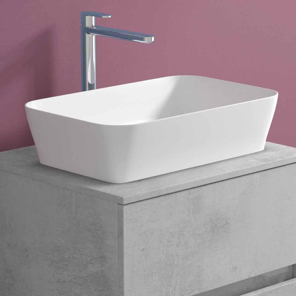 Prostokątny blat umywalka wykonana z litego matowego, nieprzezroczystej białej żywicy mineralnej, i wykończone w nieprzezroczystej żelkotem, co powoduje, że wyrób wodoodporny.