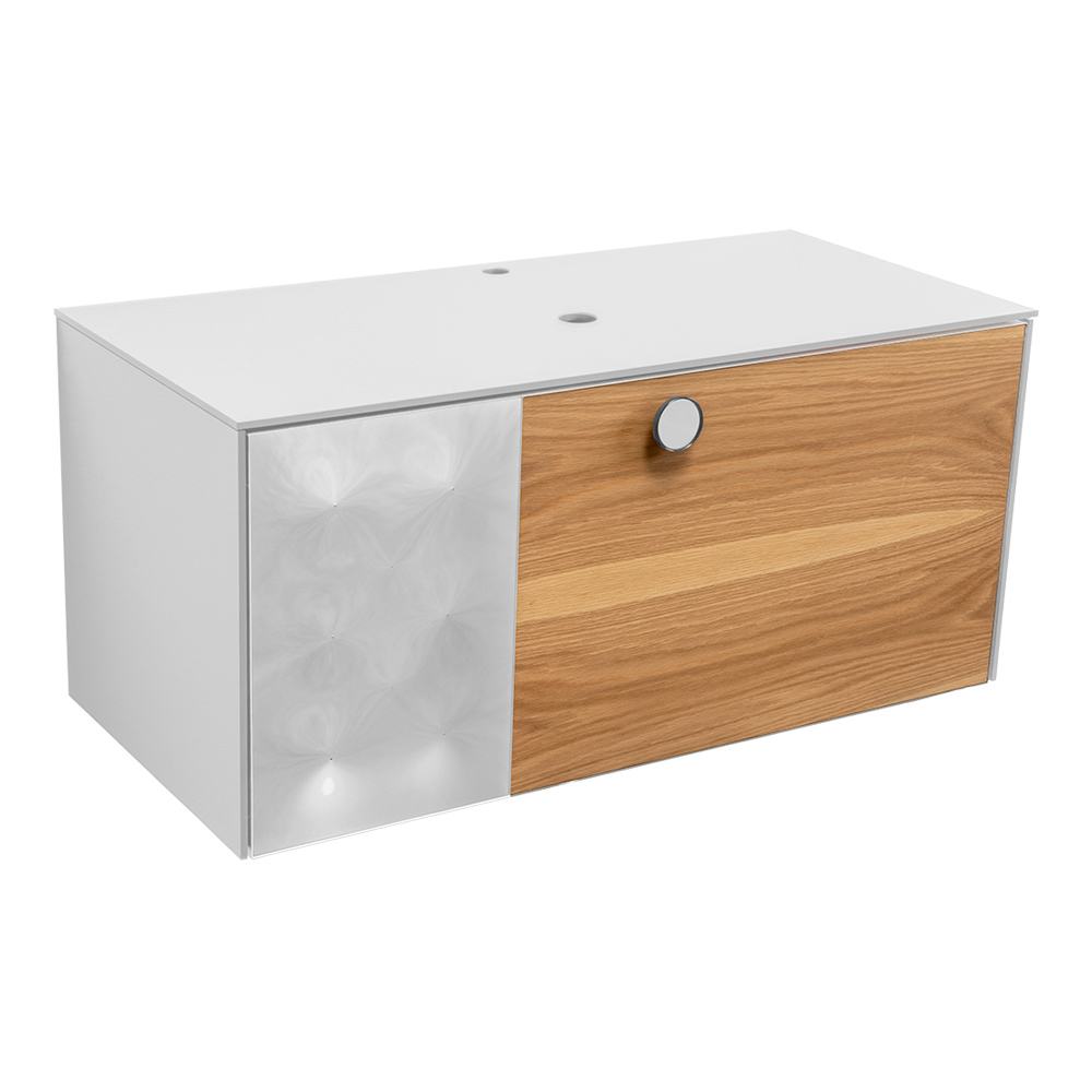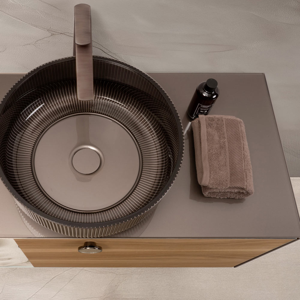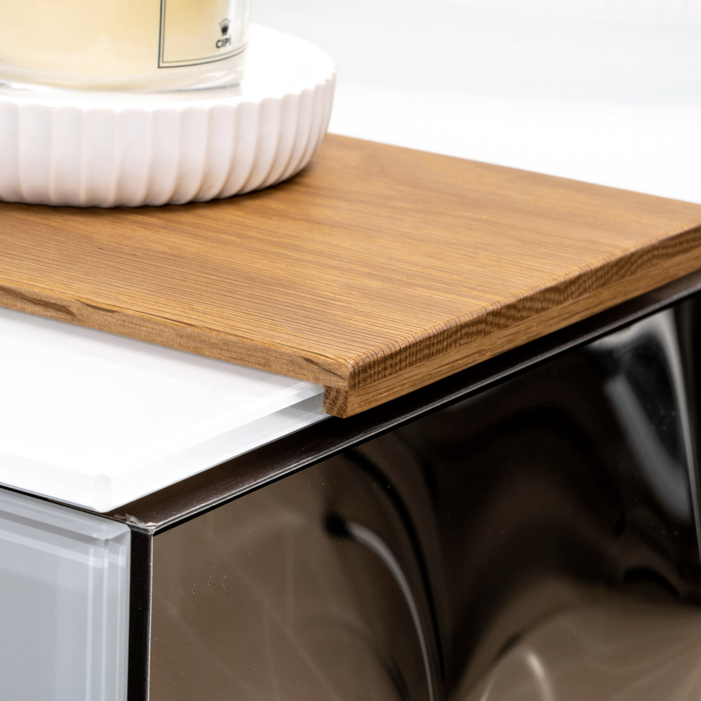 Centralna część wykonana z naturalnego drewna z widocznym usłojeniem harmonijnie komponuje się z blatem i bokami wykonanymi z 8-milimetrowego, hartowanego szkła o ekstra czystej barwie . Boczna wkładka szuflady wykonana jest z giętego szkła , charakteryzującego się trójwymiarowym efektem ze świetlistymi refleksami, wzbogacając tym samym projekt o wyrazisty i wyrafinowany detal.