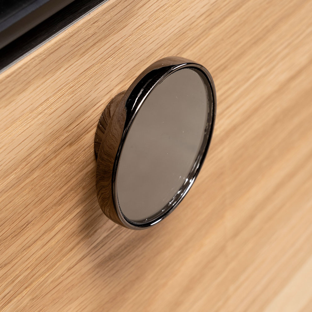 Zewnętrzna szuflada posiada polerowany metalowy uchwyt z lustrem o takim samym wykończeniu.