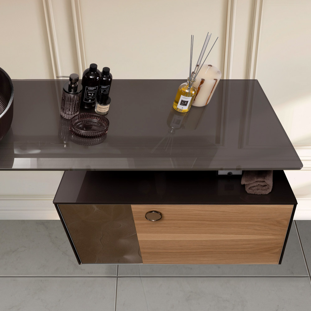 Centralna część wykonana z naturalnego drewna z widocznym usłojeniem harmonijnie komponuje się z blatem i bokami wykonanymi z 8-milimetrowego, hartowanego szkła o ekstra czystej barwie . Boczna wkładka szuflady wykonana jest z giętego szkła , charakteryzującego się trójwymiarowym efektem ze świetlistymi refleksami, wzbogacając tym samym projekt o wyrazisty i wyrafinowany detal.
