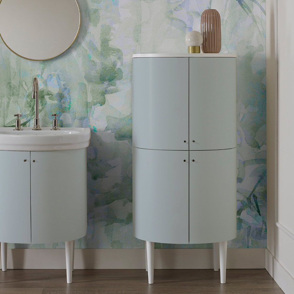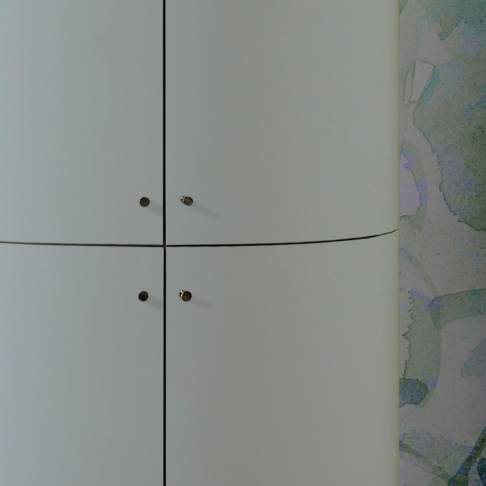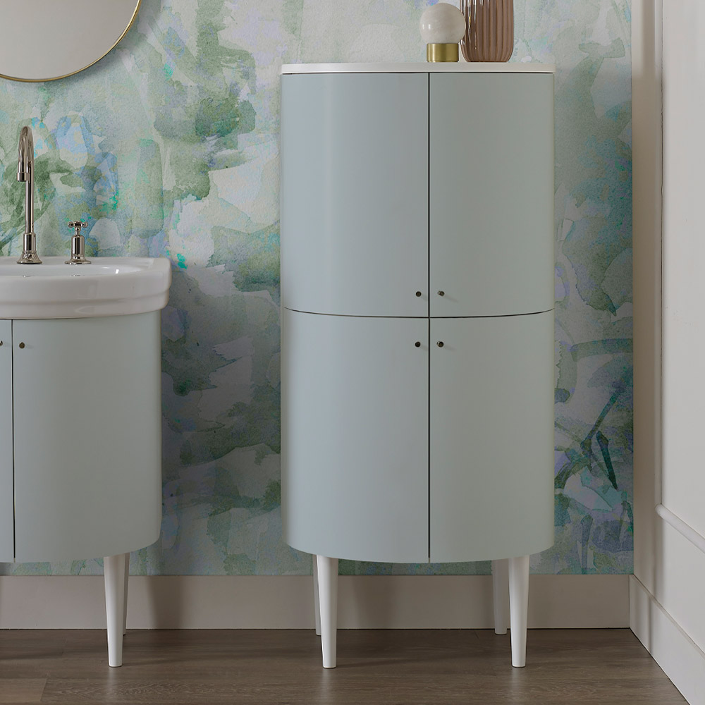 Kolumna MDF z czterema drzwiami jasnoniebieskie matowe wykończenie które zamykają trzy półki, z których dwie szklane i jedna w Hydro MDF. Górna półka i nogi są w matowym białym wykończeniu, a gałki są w niklowanym wykończeniu.
