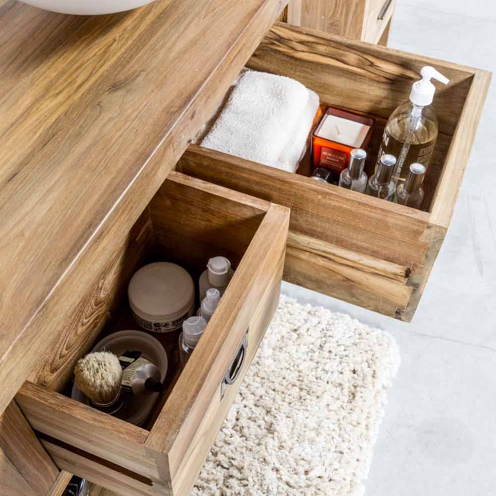 Nowoczesna szafka łazienkowa z naturalnego drewna tekowego z 2 szufladami.