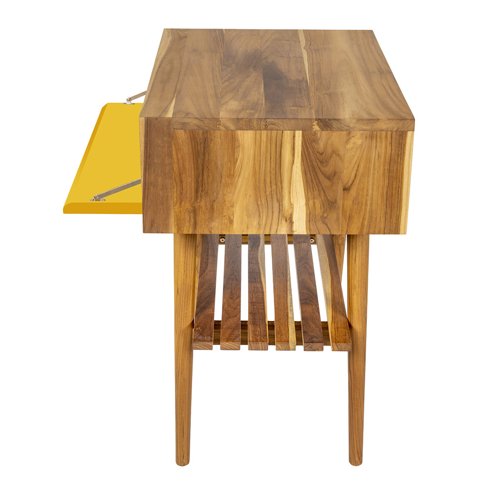 Stojąca podłogowa szafka łazienkowa wykonana z naturalnego drewna tekowego z recyklingu z szufladą z klapką z żółtego drewna mahoniowego , koloru związanego ze zmianą i słoneczną, otwartą osobowością, która przywraca w myślach ciepłe odcienie słońca, światła i lata. Jego struktura charakteryzuje się prostymi kształtami i praktycznymi przestrzeniami idealnymi do zorganizowania łazienki w elegancki i funkcjonalny sposób, aby uzyskać oryginalny efekt o silnej, nowoczesnej osobowości .