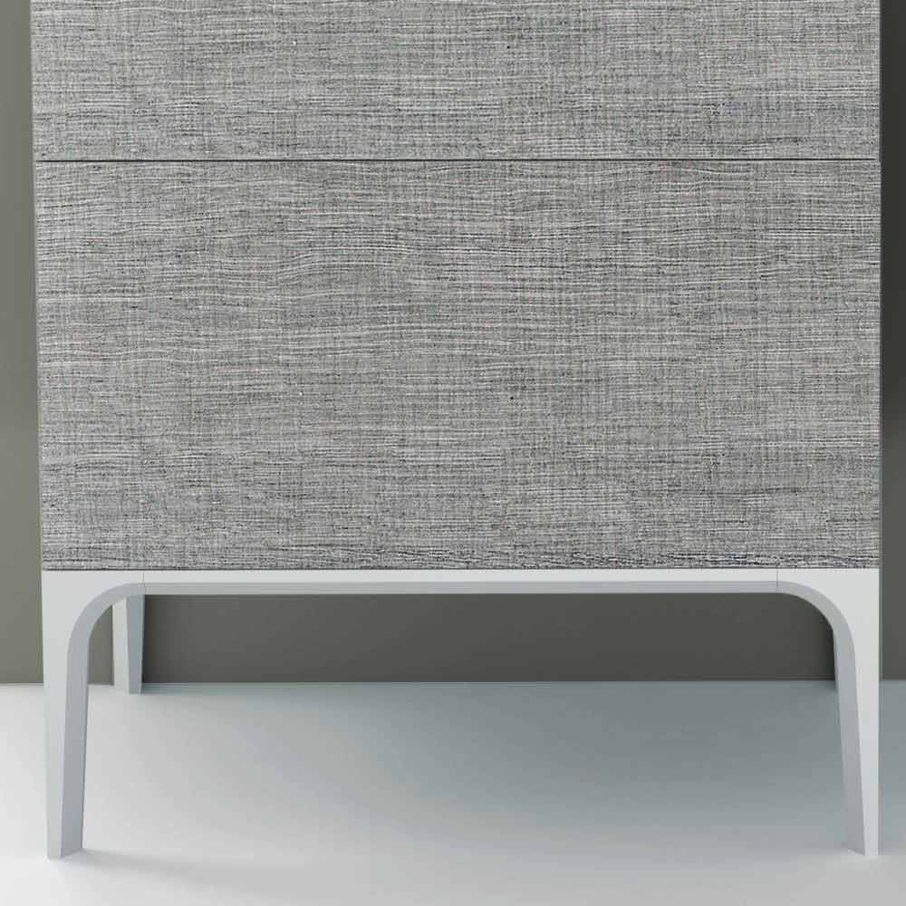 Elegancka szafka pod umywalkę z 2 szufladami o solidnych i harmonijnych liniach z eko-drewna z nóżkami z litego drewna perłowego szarego. Zintegrowany blat ceramiczny. Dostępne w różnych wykończeniach. Szafka łazienkowa Ambra wyraża elegancję i kaliber między nowoczesnością a tradycją dzięki ciepłej, solidnej i harmonijnej architekturze oraz stopom o wieloaspektowych powierzchniach z litego drewna.