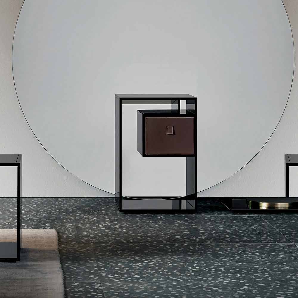 Ta szafka nocna charakteryzuje się eleganckim i minimalistycznym designem w całości wykonanym z przydymionego szkła.