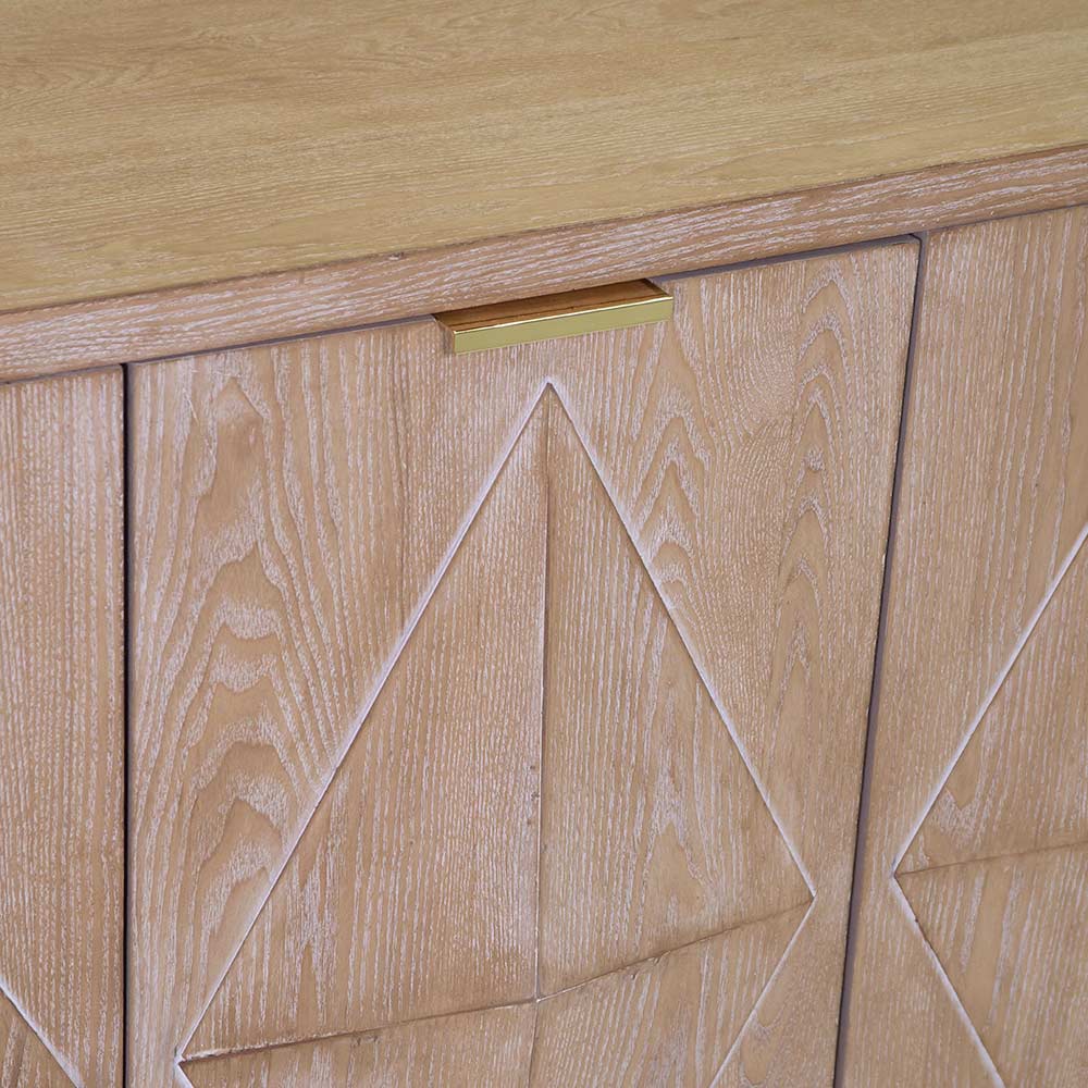 Nogi z drewna jodłowego nadają szafce solidną strukturę, wzbogaconą o czysty i nowoczesny design. Drzwi, ozdobione grawerowanym wzorem geometrycznym, dodają odrobinę oryginalności i wyrafinowania.