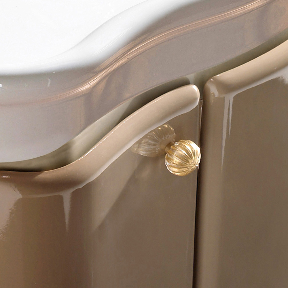Szafka łazienkowa z płyty MDF z dwojgiem drzwi i dwukolorową lakierowaną szufladą w kolorze karmelu o strukturze kości słoniowej , z białą ceramiczną umywalką . W zestawie mosiężne gałki i zlewozmywak .